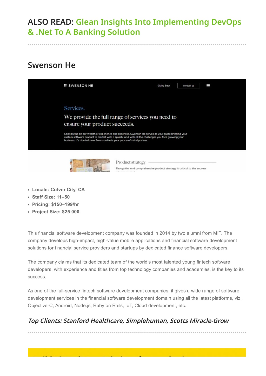 ALSO READ: Glean Insights Into Implementing DevOps & .Net To A Banking Solution Swenson He Locale: Culver City, CA Staff Size: 11–50 Pricing: $150–199/hr Project Size: $25 000 This financial software development company was founded in 2014 by two alumni from MIT. The company develops highimpact, highvalue mobile applications and financial software development solutions for financial service providers and startups by dedicated finance software developers. The company claims that its dedicated team of the world’s most talented young fintech software developers, with experience and titles from top technology companies and academies, is the key to its success. As one of the fullservice fintech software development companies, it gives a wide range of software development services in the financial software development domain using all the latest platforms, viz. ObjectiveC, Android, Node.js, Ruby on Rails, IoT, Cloud development, etc. Top Clients: Stanford Healthcare, Simplehuman, Scotts Miracle-Grow