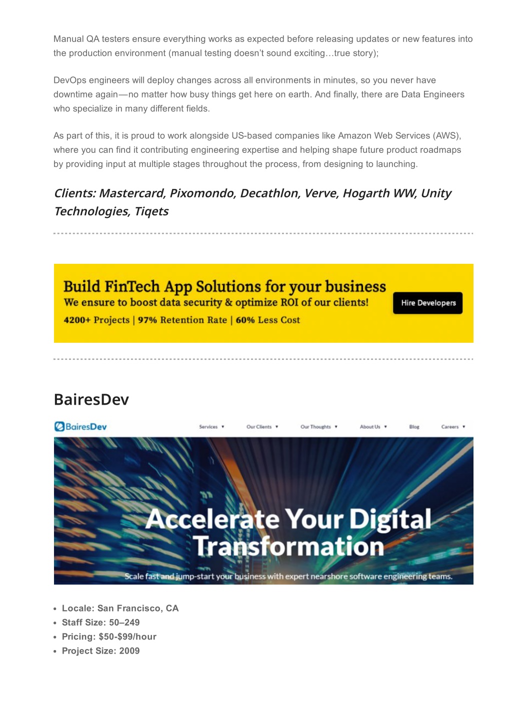 Manual QA testers ensure everything works as expected before releasing updates or new features intoManual QA testers ensure everything works as expected before releasing updates or new features into the production environment (manual testing doesn’t sound exciting…true story); DevOps engineers will deploy changes across all environments in minutes, so you never have downtime again — no matter how busy things get here on earth. And finally, there are Data Engineers who specialize in many different fields. As part of this, it is proud to work alongside USbased companies like Amazon Web Services (AWS), where you can find it contributing engineering expertise and helping shape future product roadmaps by providing input at multiple stages throughout the process, from designing to launching. Clients: Mastercard, Pixomondo, Decathlon, Verve, Hogarth WW, Unity Technologies, Tiqets BairesDev Locale: San Francisco, CA Staff Size: 50–249 Pricing: $50$99/hour Project Size: 2009 BairesDev is an innovative financial application development company with a mission to help brands of