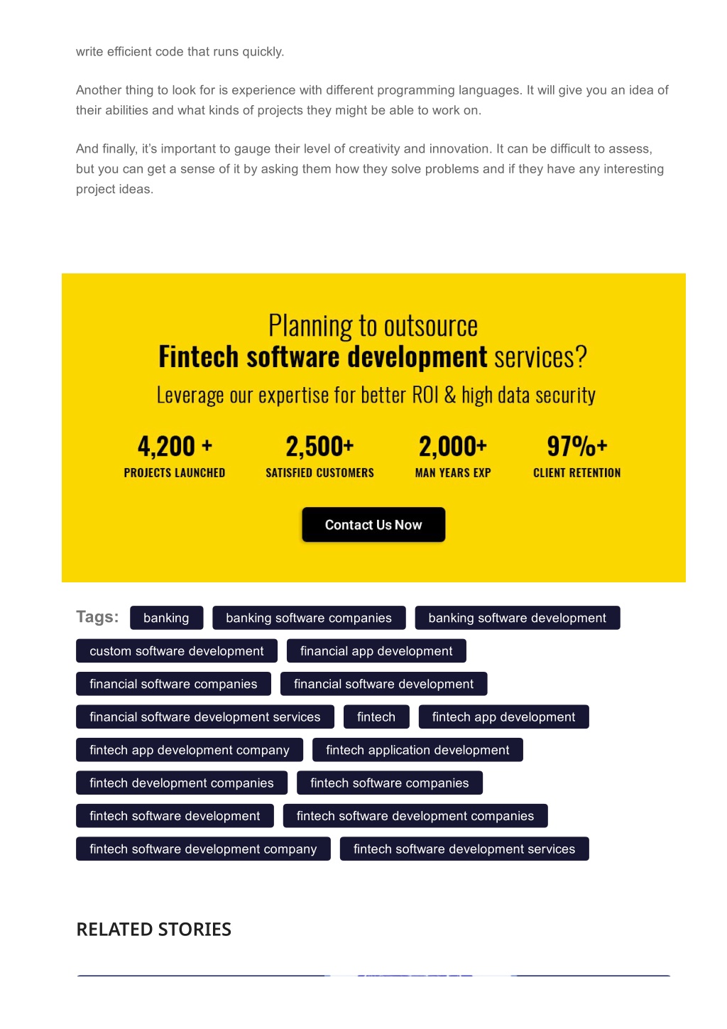 write efficient code that runs quickly. Another thing to look for is experience with different programming languages. It will give you an idea of their abilities and what kinds of projects they might be able to work on. And finally, it’s important to gauge their level of creativity and innovation. It can be difficult to assess, but you can get a sense of it by asking them how they solve problems and if they have any interesting project ideas. Tags: banking banking software companies banking software development custom software development financial app development financial software companies financial software development financial software development services fintech fintech app development fintech app development company fintech application development fintech development companies fintech software companies fintech software development fintech software development companies fintech software development company fintech software development services RELATED STORIES