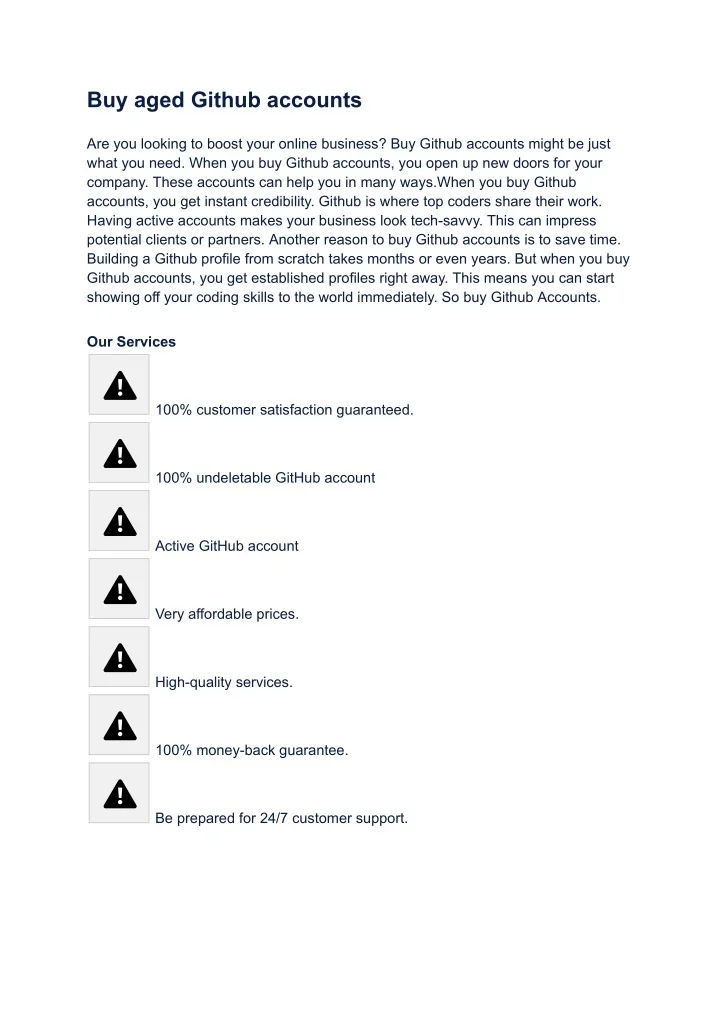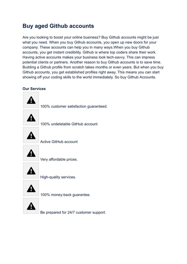 Buy aged Github accounts Are you looking to boost your online business? Buy Github accounts might be just what you need. When you buy Github accounts, you open up new doors for your company. These accounts can help you in many ways.When you buy Github accounts, you get instant credibility. Github is where top coders share their work. Having active accounts makes your business look tech-savvy. This can impress potential clients or partners. Another reason to buy Github accounts is to save time. Building a Github profile from scratch takes months or even years. But when you buy Github accounts, you get established profiles right away. This means you can start showing off your coding skills to the world immediately. So buy Github Accounts. Our Services 100% customer satisfaction guaranteed. 100% undeletable GitHub account Active GitHub account Very affordable prices. High-quality services. 100% money-back guarantee. Be prepared for 24/7 customer support.