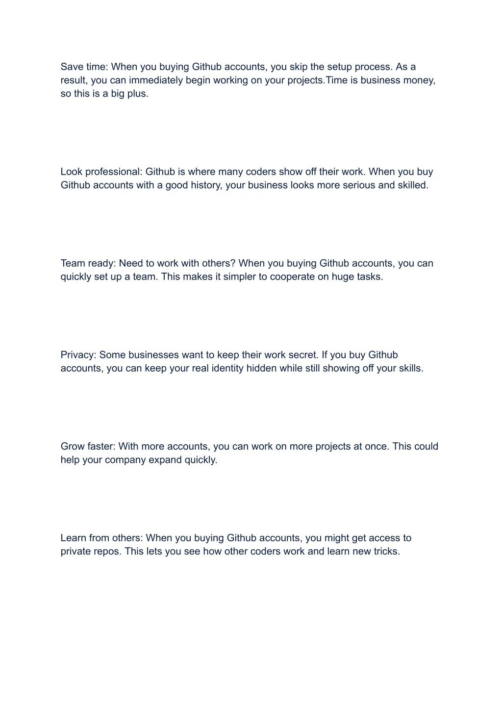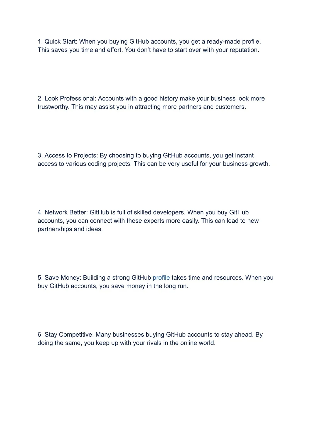 1. Quick Start: When you buying GitHub accounts, you get a ready-made profile. This saves you time and effort. You don’t have to start over with your reputation. 2. Look Professional: Accounts with a good history make your business look more trustworthy. This may assist you in attracting more partners and customers. 3. Access to Projects: By choosing to buying GitHub accounts, you get instant access to various coding projects. This can be very useful for your business growth. 4. Network Better: GitHub is full of skilled developers. When you buy GitHub accounts, you can connect with these experts more easily. This can lead to new partnerships and ideas. 5. Save Money: Building a strong GitHub profile takes time and resources. When you buy GitHub accounts, you save money in the long run. 6. Stay Competitive: Many businesses buying GitHub accounts to stay ahead. By doing the same, you keep up with your rivals in the online world.