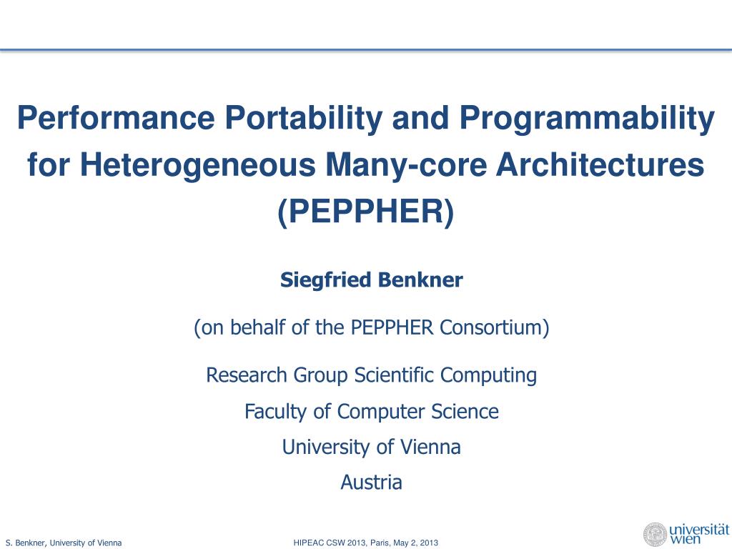 Performance Portability and Programmability for Heterogeneous Many-coreArchitectures (PEPPHER) Siegfried Benkner (on behalf ofthe PEPPHER Consortium) Research Group Scientific Computing Faculty of Computer Science University of Vienna Austria