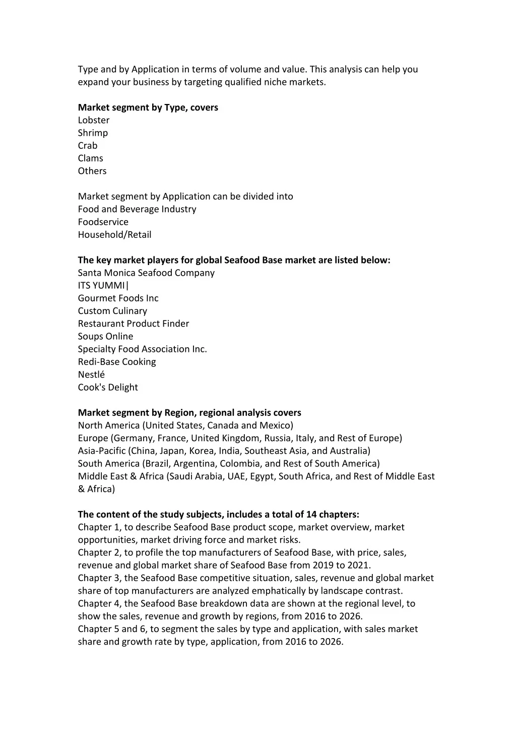 Type and by Application in terms of volume and value. This analysis can help you expand your business by targeting qualified niche markets. Market segment by Type, covers Lobster Shrimp Crab Clams Others Market segment by Application can be divided into Food and Beverage Industry Foodservice Household/Retail The key market players for global Seafood Base market are listed below: Santa Monica Seafood Company ITS YUMMI| Gourmet Foods Inc Custom Culinary Restaurant Product Finder Soups Online Specialty Food Association Inc. Redi-Base Cooking Nestlé Cook's Delight Market segment by Region, regional analysis covers North America (United States, Canada and Mexico) Europe (Germany, France, United Kingdom, Russia, Italy, and Rest of Europe) Asia-Pacific (China, Japan, Korea, India, Southeast Asia, and Australia) South America (Brazil, Argentina, Colombia, and Rest of South America) Middle East & Africa (Saudi Arabia, UAE, Egypt, South Africa, and Rest of Middle East & Africa) The content of the study subjects, includes a total of 14 chapters: Chapter 1, to describe Seafood Base product scope, market overview, market opportunities, market driving force and market risks. Chapter 2, to profile the top manufacturers of Seafood Base, with price, sales, revenue and global market share of Seafood Base from 2019 to 2021. Chapter 3, the Seafood Base competitive situation, sales, revenue and global market share of top manufacturers are analyzed emphatically by landscape contrast. Chapter 4, the Seafood Base breakdown data are shown at the regional level, to show the sales, revenue and growth by regions, from 2016 to 2026. Chapter 5 and 6, to segment the sales by type and application, with sales market share and growth rate by type, application, from 2016 to 2026.