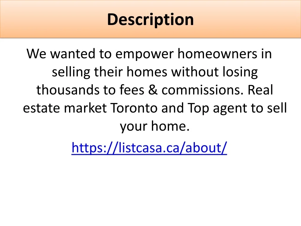 Description We wanted to empower homeowners in selling their homes without losing thousands to fees & commissions. Real estate market Toronto and Top agent to sell your home. https://listcasa.ca/about/