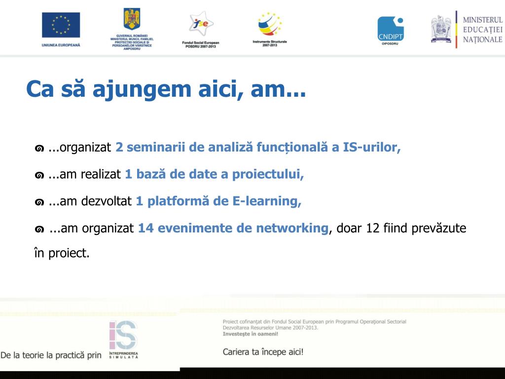 Ca să ajungem aici, am... ๑...organizat 2 seminarii de analiză funcțională a IS-urilor, ๑...amrealizat1 bază de date a proiectului, ๑ ...am dezvoltat 1 platformă de E-learning, ๑...am organizat 14 evenimente de networking, doar 12 fiind prevăzute în proiect.