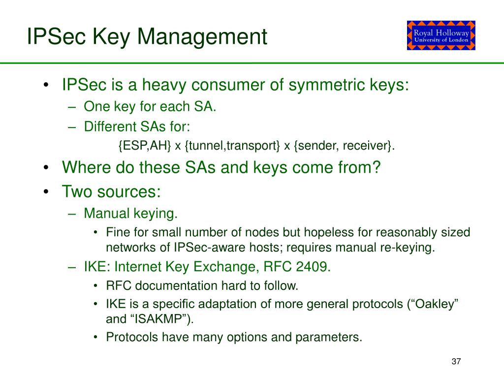 IPSec Key Management • IPSec is a heavy consumer of symmetric keys: • One key for each SA. • Different SAs for: {ESP,AH} x {tunnel,transport} x {sender, receiver}. • Where do these SAs and keys come from? • Two sources: • Manual keying. • Fine for small number of nodes but hopeless for reasonably sized networks of IPSec-aware hosts; requires manual re-keying. • IKE: Internet Key Exchange, RFC 2409. • RFC documentation hard to follow. • IKE is a specific adaptation of more general protocols (“Oakley” and “ISAKMP”). • Protocols have many options and parameters.