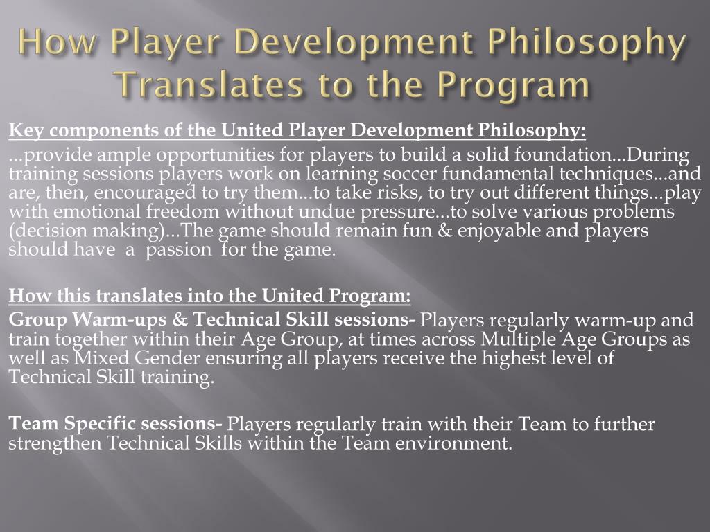 How Player Development Philosophy Translates to the Program Key components of the United Player Development Philosophy: ...provide ample opportunities for players to build a solid foundation...During training sessions players work on learning soccer fundamental techniques...and are, then, encouraged to try them...to take risks, to try out different things...play with emotional freedom without undue pressure...to solve various problems (decision making)...The game should remain fun & enjoyable and players should have a passion for the game. How this translates into the United Program: Group Warm-ups & Technical Skill sessions- Players regularly warm-up and train together within their Age Group, at times across Multiple Age Groups as well as Mixed Gender ensuring all players receive the highest level of Technical Skill training. Team Specific sessions- Players regularly train with their Team to further strengthen Technical Skills within the Team environment.