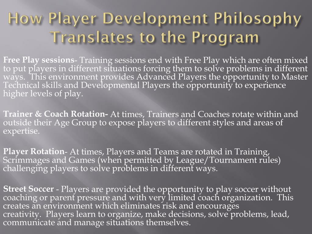 How Player Development Philosophy Translates to the Program Free Play sessions- Training sessions end with Free Play which are often mixed to put players in different situations forcing them to solve problems in different ways. This environment provides Advanced Players the opportunity to Master Technical skills and Developmental Players the opportunity to experience higher levels of play. Trainer & Coach Rotation- At times, Trainers and Coaches rotate within and outside their Age Group to expose players to different styles and areas of expertise. Player Rotation- At times, Players and Teams are rotated in Training, Scrimmages and Games (when permitted by League/Tournament rules) challenging players to solve problems in different ways. Street Soccer - Players are provided the opportunity to play soccer without coaching or parent pressure and with very limited coach organization. This creates an environment which eliminates risk and encourages creativity. Players learn to organize, make decisions, solve problems, lead, communicate and manage situations themselves.