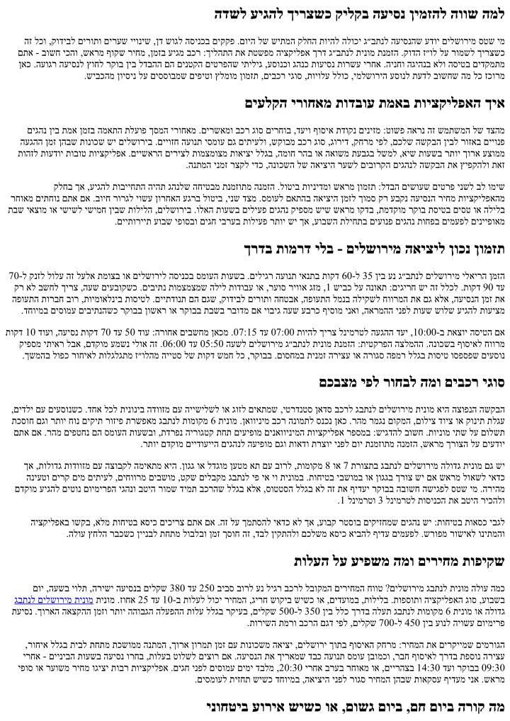 ,יברש םויב .תוקלחהו תולק תונואת בקע העיסנל תוקד 25 דע 15 ףיסוהל לוכי הנועב ןושאר םשג םוי ,םילשוריב .ץפוק שוקיבה ינוציק ריווא גזמב שישכ .םילשורימ ג״בתנל תינומל רתוי םיכורא הנתמה ינמז :האצותה .תוינוריעניב תועיסנ ינפ לע ריעב תורצק תועיסנ םיפידעמ םימיוסמ םיגהנ וכרעיה ,תומיסח לע תושדחהמ שופ םתלביק םא .תמדקומ הערתה ילב םיעטקמ רוגסל הלולע הרטשמה ,םייזכרמ העונת יריצ ביבס ינוחטיב עוריא .תוקד 15 דע 10 דוע לש ריחמב םג ,443 שיבכ ךרד יפולח ביתנב שמתשהל גהנהמ ושקב וא רתוי תמדקומ האיציל שי םג םיתיעלו 3 לנימרט לש תוסינכהו םינוינחה תא בטיה ריכמש גהנ רוכשל הווש ןאכ .םיבוכיעל רתוי םישיגרל םישנא ךפוה הסיט ינפל ןבל הליל הז םא םג ,ןמז ךוסחל ידכ עקרקה תמרב וא הנוילעה הפמרב םכתא דירוהל םאה עדוי הסונמ גהנ ,םיגירח םיסמועב .ריהמ הדרוה ביתנל השיג ול .תופסונ תוקד יתש לש הכילה שרוד לודג ץחל םידירומש םינטק םיפיט העדוה גהנל וחלש ,םימוד םיניינב ירפסמ םע ךורא בוחרב םיררוגתמ םתא םא .היצקילפאב קיודמ םוקימה תא ורמש ףוסיאה ינמז ינפל תוקד שמח לש םירפסמש ןובשחב תחקל ךירצ הלילה עצמאב גבתנל םילשורימ תינומ ןימזמש ימ .הבורק תמוצ ונייצ וא הסינכה לש יתוזח רואית םע הרצק דח בוחרב םירתוימ םיבוביס תכסוח הפוקש תחא העדוה .םיקחשמ ינג וא תויתניפ תויונח ומכ םינמיס לע םיכמתסמ םיגהנו ,םיראומ אל םיתיעל םיתב .ירטס תודווזמ שי םא לבא ,סימעהלו תישילש הרוש לפקל ללכ ךרדב ועדיי ןאווינימה יגהנ .הריהמ האיציל די גשיהב דיה יקיתש ךכ תודווזמה תא ונגרא האור ינא םעפ רחא םעפ ךא ,ילאיווירט עמשנ הז .הרבחהו לנימרטה תא דיינב שארמ ורידגהו ,םימ קובקב וחק .שארמ ונכדע ,תולודג תוחישק .תורקי תוקד 15 םידבאמו ןוכנ אלה רעשל םיעיגמ םיעסונ המב רוחבל יתמ - תידיימ הנמזה תמועל תנמזותמ הנמזה :ןורסיחה .הריהמ העגהו יתורחת ריחמ אוה ןורתיה .תויתרגש תוליעפ תועשב םיאצוי םתאשכ וא םינמזה חולב םישימג םתאשכ הבוט תידיימ הנמזה .ןמז ןולח םכל ןיירשמש גהנ החיטבמ ,תאז תמועל ,תנמזותמ הנמזה .ןנכותמהמ רתוי וניתמתש ןכתיי ,ןושאר ימיב םדקומ רקובב וא הליל תועשב ,םידלי םע החפשמ םתאש וא הרצק ןשקנוק תסיט םכל שי םא .קפסה תוינידמל םאתהב ,האיציל ךומס ןכדעתהל וא שארמ עובק תויהל לולע ריחמה .ףסכ ךוסחת תידיימ הנמזה ,תועוגר תועשב טסוק ואול תסיטל בג קית םע דבל םיעסונ םתא םא .תנמזותמ הנמזה ופידעת םייפיצפס םיכרצ וא דחוימ דויצ םע םיעסונל םישגד טניקרוק וא םילפקתמ םיינפוא םע םתא םא .ןגומ ןעטמ אתו רתוי םיבוט םיעוזעז ימלוב ללגב גבתנל יפ יא יו תינומ ופידעי שיגר דויצ םע םימלצ םילגלג אסיכ םע דיינתמש ימ .דופירב עוגפל אל ידכ הכימשב תוסכל וא תועוב ןוליינב ףוטעל ושקבי םיגהנהמ קלח .היצקילפאב תאז ונייצ ,ילמשח םיניינועמ םתא םא ןייצל ורכז .דבלב ןוסחא םוקמ וא הפמר ךירצ םאה ריהבהלו שארמ םוי תוחפל ןימזהל בושח ךא ,םאתומ בכר שקבל לכוי .הקלח הרוצב ףצרה תא ןנכתי גהנהש ידכ ,לשמל המואה יניינב דיל דחא ,ךרדב ףסונ ףוסיאב םהילע רתוול אל יאדכש תורישו תוחיטב יטביה םיגהנ .ינכדע גורידו גהנ תנומת ,תמאות יושיר תיחול הגיצמ היצקילפאהש ואדו .הנבה יא לכ טעמכ התיחפמ האיציה ינפל גהנה םע הריהב תרושקת םילשורימ הלודג תינומ חיר - םכל הארנ אל והשמ םא .טקש עקרב הקיזומ וא תמיוסמ הרוטרפמט לע רומשל םישקבמ םא וננולתי אל םייעוצקמ םכוסש העיסנה ריחמ לש ךסמ םוליצ ורמש .ץחל ךותמ תולעל רשאמ רחא בכר ןימזהלו תידיימ לטבל ףידע - הניקת אל הרוגח ,בכרב ףירח גבתנל .תשלחנ הטילקה םהבש םירוזאב וא סמוע לש תועשב םיעסונשכ דחוימב ,שארמ םיקקפ ףוקעל םיכרדו םיפדעומ םילולסמ םיהזמ היצקילפאה וא Waze םא .תומדקומה רקובה תועשב הקלח 1 שיבכ לא םורד ןיגב שיבכמ האיציה .רתויב ריהמה אוה 1 שיבכ ,םימיה בורב רחואמ רבחתהלו - תרש תמר ךרד - ןיגבל המורד תאצל וא ,אצומ ךרד ךותחל ופידעיש םיגהנ שי ,איגה רעש רוזאב וא לארה ףלחמב דבכ סמוע הטלחהה ,ומצע ג״בתנב .ןמש ןב ףלחמ ביבס סמוע ןיא םא קודבל בושח ךא ,הריבס הפולח