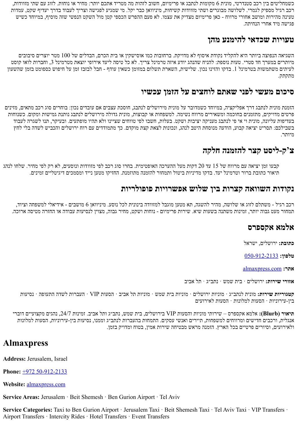 Blurb: ALMA Express provides premium taxi and VIP transfer services in Jerusalem, Beit Shemesh, Ben Gurion Airport, and Tel Aviv. Available 24/7 with professional English-speaking drivers and modern, spacious vehicles for families, tourists, and business travelers. We specialize in airport transfers, intercity rides, hotel and event transport, and private tours across Israel. Book in advance for reliable, safe, on-time service.