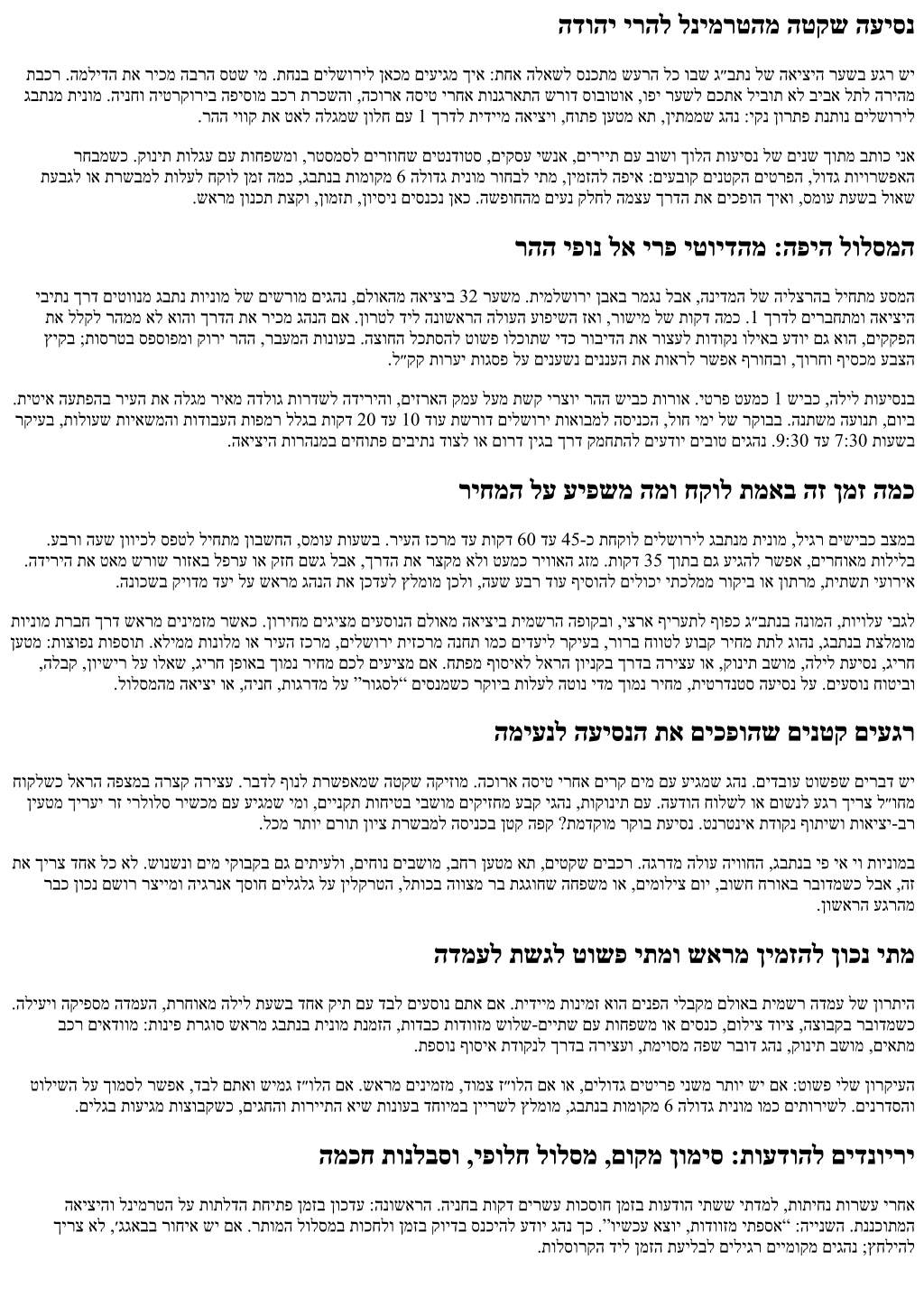 הדוהי ירהל לנימרטהמ הטקש העיסנ תבכר .המלידה תא ריכמ הברה סטש ימ .תחנב םילשוריל ןאכמ םיעיגמ ךיא :תחא הלאשל סנכתמ שערה לכ ובש ג״בתנ לש האיציה רעשב עגר שי גבתנמ תינומ .הינחו היטרקוריב הפיסומ בכר תרכשהו ,הכורא הסיט ירחא תונגראתה שרוד סובוטוא ,ופי רעשל םכתא ליבות אל ביבא לתל הריהמ .רהה יווק תא טאל הלגמש ןולח םע 1 ךרדל תידיימ האיציו ,חותפ ןעטמ את ,ןיתממש גהנ :יקנ ןורתפ תנתונ םילשוריל רחבמשכ .קונית תולגע םע תוחפשמו ,רטסמסל םירזוחש םיטנדוטס ,םיקסע ישנא ,םיריית םע בושו ךולה תועיסנ לש םינש ךותמ בתוכ ינא תעבגל וא תרשבמל תולעל חקול ןמז המכ ,גבתנב תומוקמ 6 הלודג תינומ רוחבל יתמ ,ןימזהל הפיא :םיעבוק םינטקה םיטרפה ,לודג תויורשפאה .שארמ ןונכת תצקו ,ןומזת ,ןויסינ םיסנכנ ןאכ .השפוחהמ םיענ קלחל המצע ךרדה תא םיכפוה ךיאו ,סמוע תעשב לואש רהה יפונ לא ירפ יטוידהמ :הפיה לולסמה יביתנ ךרד םיטוונמ גבתנ תוינומ לש םישרומ םיגהנ ,םלואהמ האיציב 32 רעשמ .תימלשורי ןבאב רמגנ לבא ,הנידמה לש הילצרהב ליחתמ עסמה תא ללקל רהממ אל אוהו ךרדה תא ריכמ גהנה םא .ןורטל דיל הנושארה הלועה עופישה זאו ,רושימ לש תוקד המכ .1 ךרדל םירבחתמו האיציה ץיקב ;תוסרטב ספסופמו קורי רהה ,רבעמה תונועב .הצוחה לכתסהל טושפ ולכותש ידכ רובידה תא רוצעל תודוקנ וליאב עדוי םג אוה ,םיקקפה .ל״קק תורעי תוגספ לע םינעשנ םיננעה תא תוארל רשפא ףרוחבו ,ךורחו ףיסכמ עבצה .תיטיא העתפהב ריעה תא הלגמ ריאמ הדלוג תורדשל הדיריהו ,םיזראה קמע לעמ תשק ירצוי רהה שיבכ תורוא .יטרפ טעמכ 1 שיבכ ,הליל תועיסנב רקיעב ,תולועש תויאשמהו תודובעה תופמר ללגב תוקד 20 דע 10 דוע תשרוד םילשורי תואובמל הסינכה ,לוח ימי לש רקובב .הנתשמ העונת ,םויב .האיציה תורהנמב םיחותפ םיביתנ דוצל וא םורד ןיגב ךרד קמחתהל םיעדוי םיבוט םיגהנ .9:30 דע 7:30 תועשב ריחמה לע עיפשמ המו חקול תמאב הז ןמז המכ .עברו העש ןוויכל ספטל ליחתמ ןובשחה ,סמוע תועשב .ריעה זכרמ דע תוקד 60 דע 45-כ תחקול םילשוריל גבתנמ תינומ ,ליגר םישיבכ בצמב .הדיריה תא טאמ שרוש רוזאב לפרע וא קזח םשג לבא ,ךרדה תא רצקמ אלו טעמכ ריוואה גזמ .תוקד 35 ךותב םג עיגהל רשפא ,םירחואמ תולילב .הנוכשב קיודמ דעי לע שארמ גהנה תא ןכדעל ץלמומ ןכלו ,העש עבר דוע ףיסוהל םילוכי יתכלממ רוקיב וא ןותרמ ,תיתשת יעוריא תוינומ תרבח ךרד שארמ םינימזמ רשאכ .ןוריחמ םיגיצמ םיעסונה םלואמ האיציב תימשרה הפוקבו ,יצרא ףירעתל ףופכ ג״בתנב הנומה ,תויולע יבגל ןעטמ :תוצופנ תופסות .אליממ תונולמ וא ריעה זכרמ ,םילשורי תיזכרמ הנחת ומכ םידעיל רקיעב ,רורב חווטל עובק ריחמ תתל גוהנ ,גבתנב תצלמומ ,הלבק ,ןוישיר לע ולאש ,גירח ןפואב ךומנ ריחמ םכל םיעיצמ םא .חתפמ ףוסיאל לארה ןוינקב ךרדב הריצע וא ,קונית בשומ ,הליל תעיסנ ,גירח .לולסמהמ האיצי וא ,הינח ,תוגרדמ לע ”רוגסל“ םיסנמשכ רקויב תולעל הטונ ידמ ךומנ ריחמ ,תיטרדנטס העיסנ לע .םיעסונ חוטיבו המיענל העיסנה תא םיכפוהש םינטק םיעגר חוקלשכ לארה הפצמב הרצק הריצע .רבדל ףונל תרשפאמש הטקש הקיזומ .הכורא הסיט ירחא םירק םימ םע עיגמש גהנ .םידבוע טושפש םירבד שי ןיעטמ ךירעי רז ירלולס רישכמ םע עיגמש ימו ,םיינקת תוחיטב יבשומ םיקיזחמ עבק יגהנ ,תוקונית םע .העדוה חולשל וא םושנל עגר ךירצ ל״וחמ .לכמ רתוי םרות ןויצ תרשבמל הסינכב ןטק הפק ?תמדקומ רקוב תעיסנ .טנרטניא תדוקנ ףותישו תואיצי-בר תא ךירצ דחא לכ אל .שונשנו םימ יקובקב םג םיתיעלו ,םיחונ םיבשומ ,בחר ןעטמ את ,םיטקש םיבכר .הגרדמ הלוע היווחה ,גבתנב יפ יא יו תוינומב רבכ ןוכנ םשור רציימו היגרנא ךסוח םילגלג לע ןילקרטה ,לתוכב הווצמ רב תגגוחש החפשמ וא ,םימוליצ םוי ,בושח חרואב רבודמשכ לבא ,הז .ןושארה עגרהמ הדמעל תשגל טושפ יתמו שארמ ןימזהל ןוכנ יתמ .הליעיו הקיפסמ הדמעה ,תרחואמ הליל תעשב דחא קית םע דבל םיעסונ םתא םא .תידיימ תונימז אוה םינפה ילבקמ םלואב תימשר הדמע לש ןורתיה בכר םיאדוומ :תוניפ תרגוס שארמ גבתנב תינומ תנמזה ,תודבכ תודווזמ שולש-םייתש םע תוחפשמ וא םיס