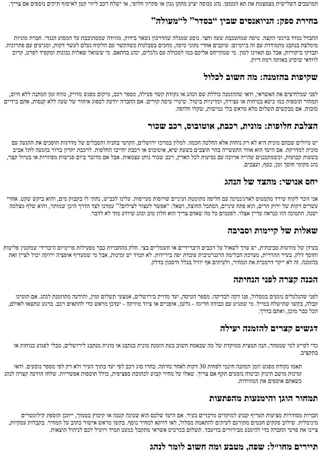 ,תומרל םשמו 443 שיבכ ךרד ךרד רוציק טטרשל רשפא ,רהל הסינכב םילודג םיקקפב .Waze ןיבל םיגהנ ןיב הנשי תודידי תמייק ,ומצע לולסמל ,תויתדוקנ תוריגס שי םא .רתוי תקיודמ תראשנ 1 ךרד ,הקיתעה ריעל ךומס תונולמל וא זכרמל .ריעה ברעמ-ןופצב םידעיל רקיעב יטנוולר הז לבא .יכדרמ תעבג ךרד זכרמל קומחיו םורד ןיגב רחבי הסונמ גהנ ביבא לת אל איה םילשורי :דעי יפל בכר תמאתה םירצ תובוחר ןורמת םיתיעל תושרוד הקיתעה ריעהו העקב ,תואלחנ ומכ תונוכש ,םילשוריב .דבלב םישנא רפסמ יפל בכר ןימזהל איה הצופנ תועט תרדוסמ הינח םע ןולמ תיב אוה דעיה םא ,ינש דצמ .קנע ןאווינימ אלו ינוניב בכר ףידעי השמ ןימי תואטמסל עיגמש ימ .םייתריצי הקירפ יחטש וא .הנמזה לצפל רשאמ תוחפ הלעתו תועיסנ יתש ךוסחת גבתנב תומוקמ 6 הלודג תינומ ,ריעל הסינכב לודג םלואב עוריא וא בוביס ךסוח קיודמ ןויצ .תויזכרמ תוסינכ עברא שי אליממב ,לשמל .הסינכ וא רעש ללוכ ,תקיודמה דעיה תבותכ תא םכמצעל ומשרית :ללכ דוע הנה .רתוימ סנק לומ ודמעת אלש ידכ ,הקירפל רתומה םוקמב קוידב םכתא דירוהל םיעדוי םיימוקמ םיגהנ ,תוריית יזכרמב .קתקתמ הנומו רתוימ חלמה םי ,עבש ראב ,הפיח ,שמש תיב ,ביבא לת :םידעי ןיב םילדבה שמתשהל לוכי חלמה םיל וא עבש ראבל ,הפיחל ,שמש תיבל ,ביבא לתל גבתנמ תינומ שפחמש ימ םג ןכלו ,ץראה לכ לש תמוצכ שמשמ ג״בתנ הנמזהב ןויגיה שי ,חלמה םיל .הנחת דיל דעיה םא ריעה זכרמל תבכר לוקשל יאדכ רקוב תועשבו ,רתוי הרצק העיסנה ,ביבא לתל .תונורקע םתואב וא העבגה רעש ךרד תיסחי הרצק ךרדה ,שמש תיבל .קקוב ןיע תונולמל םיכישממש םילייטמ וא אפס דויצ םע רקיעב ,חוורמ בכר לש תמדקומ .רופיסה תא םכל רצקי המינפ תובוחרה תא ריכמש גהנ ;ריעהמ האיציב סמוע שי םיירהצה רחא תועשב לבא ,אצומ העברא וא השולשב רבודמ םא לבא ,הריהמ תבכר תעיסנ םיתיעל קידצמש קחרמ והז .ריחמ לומ תוחונ תלאשב תעגונ רבכ הפיחל גבתנמ תינומ תינומ וכירעת הלילה תועשב :המוד עבש ראב .תולילד תובכר ןהבש תועשב דחוימב ,דואמ ינויגה ךפוה תינומב ףתתשמל ריחמה ,דויצ םע םיעסונ .םורדב 6 שיבכ לש טקשב הפי והשמ שי ,םיעבצ לבקמ רבדמהשכ ףרוח ימיבו ,ינוריעניב וקל הנתמה רשאמ רתוי ךרדב תובידאו ןוישיר ,השרומ גהנ :לכה ינפל תוחיטב דחוימב ,תרדוסמ הלבק שקבל ושייבתת לא .ןיקת הנומו ,ןוישיר תוקבדמ ,יוהיז סיטרכב םידיוצמ םישרומה םיגהנה .חוקיפל תופופכ גבתנ תוינומ םיגהנה לעו םכילע ןגמ הז .הדמעל וכישמהו ךויח ונת ,תוגרדמל לנימרטה ןיב רבעמב ”ליד“ עיצמש והשימ םכילא שגינ םא .הדובע תועיסנב .ךרדה עצמאב הרקי והשמ םא תוירחא עיצי אל ,הנומ ליעפהל ןכומ אלו ךומנ ריחמ לע שקעתמש ימ .םיללכה יפל םידבועש העיסנ רציימ ,םכלש בגה יפל בשומה תא ןווכמו ,םיתורישל וא םושנל רוצעל םיאתמ םא לאוש ,לולסמה תא ריבסמש גהנ .תוחיטב ילכ איה תובידא הזו ,ינוויכ־וד הז .יעוצקמו טקש תוריש הרומתב םילבקמ ,סמונמ השיגפ ןמז םירשאמו ,םידלי שי םא םינייצמ ,דעי םינכדעמש תוחוקל .רתוי העוגר .שגרומ תימלשוריה היווחהמ קלח איה המצע ךרדהשכ תונולחהו ,תספטמ תינוכמה .עצמאב טרס ליחתהל ומכ הז לבא ,ליעי הז יעקרק־תת תבכר וקב םילשוריל עיגהל .הגרדהה אוה םסקהמ לודג קלח םע יתעסנ םעפ .ןימי ןולח ינפל ןויצ תרשבמ ,רוחאמ ןוליא קמע ,לאמשל שמש תיב .רופיסה תא חלמה םיל גבתנמ תוינומ סרפסקא אמלא םירייצמ :הרמאו ,הצוחה הלכתסה איה .”ששש“ רמא אוה ,לארה תורהנמ ינפל תוקד יתש .תוריצע ילבו הטקש הקיזומ ושקיב .םיאושינל םינש 40 גגחש גוז .םוקמב עגרה תא םישל ןמז םהל הנתנ ךרדה .םהלש תיבה ןיידע וזה ריעה לבא ,רבנדב םירג םה ”.התיבה ונעגה ,הנה“ םיגחו ,רקוב תסיט ,הליל תסיט :םינומזת לע םילמ המכ רקוב תוסיט .טקש םיפידעמ םתאש שארמ גהנל ונייצ ,םימנמנמ םתא םא .ךרדב םיתורישו הפק יתב תחיתפ תועשל בל תמושת תוכירצמ הליל תוסיט ,םיאלמ ריעב תונולמ ,חספו תוכוס דחוימב ,םיגחב .לנימרטהמ הזירז האיצי ןיירשל ץלמומ ןכל ,ריעל הסינכ יקקפ םע שגפמ תורצוי תומדקומ .םיזוחא תורשעב הנתמהה ןמז תא ורצקתי םאותמ ףוסיא םוקימו תמדקומ 