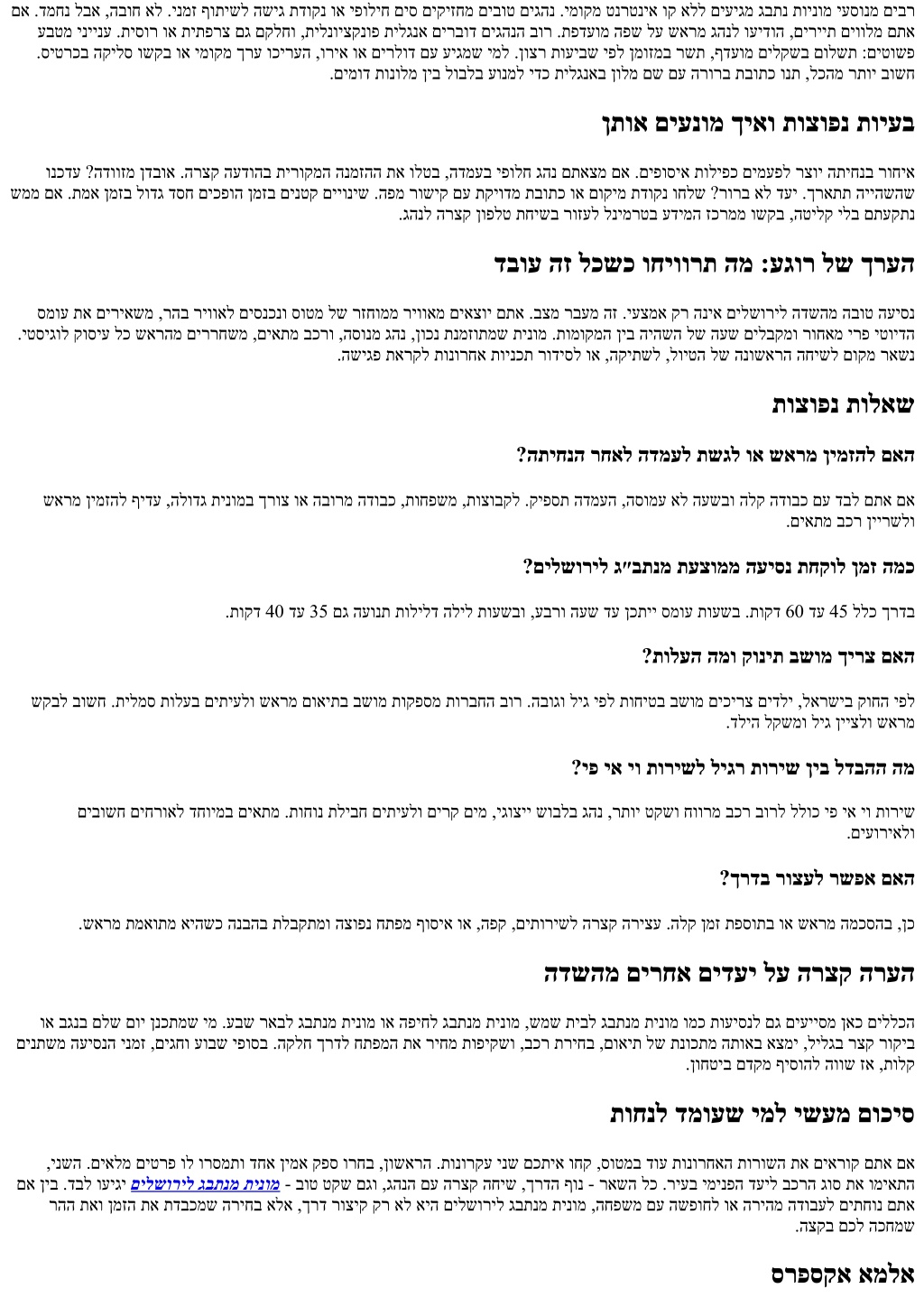 םא .דמחנ לבא ,הבוח אל .ינמז ףותישל השיג תדוקנ וא יפוליח םיס םיקיזחמ םיבוט םיגהנ .ימוקמ טנרטניא וק אלל םיעיגמ גבתנ תוינומ יעסונמ םיבר עבטמ יניינע .תיסור וא תיתפרצ םג םקלחו ,תילנויצקנופ תילגנא םירבוד םיגהנה בור .תפדעומ הפש לע שארמ גהנל ועידוה ,םיריית םיוולמ םתא .סיטרכב הקילס ושקב וא ימוקמ ךרע וכירעה ,וריא וא םירלוד םע עיגמש ימל .ןוצר תועיבש יפל ןמוזמב רשת ,ףדעומ םילקשב םולשת :םיטושפ .םימוד תונולמ ןיב לובלב עונמל ידכ תילגנאב ןולמ םש םע הרורב תבותכ ונת ,לכהמ רתוי בושח ןתוא םיענומ ךיאו תוצופנ תויעב ונכדע ?הדווזמ ןדבוא .הרצק העדוהב תירוקמה הנמזהה תא ולטב ,הדמעב יפולח גהנ םתאצמ םא .םיפוסיא תוליפכ םימעפל רצוי התיחנב רוחיא שממ םא .תמא ןמזב לודג דסח םיכפוה ןמזב םינטק םייוניש .הפמ רושיק םע תקיודמ תבותכ וא םוקימ תדוקנ וחלש ?רורב אל דעי .ךראתת הייהשהש .גהנל הרצק ןופלט תחישב רוזעל לנימרטב עדימה זכרממ ושקב ,הטילק ילב םתעקתנ דבוע הז לכשכ וחיוורת המ :עגור לש ךרעה סמוע תא םיריאשמ ,רהב ריוואל םיסנכנו סוטמ לש רזחוממ ריוואמ םיאצוי םתא .בצמ רבעמ הז .יעצמא קר הניא םילשוריל הדשהמ הבוט העיסנ .יטסיגול קוסיע לכ שארהמ םיררחשמ ,םיאתמ בכרו ,הסונמ גהנ ,ןוכנ תנמזותמש תינומ .תומוקמה ןיב היהשה לש העש םילבקמו רוחאמ ירפ יטוידה .השיגפ תארקל תונורחא תוינכת רודיסל וא ,הקיתשל ,לויטה לש הנושארה החישל םוקמ ראשנ תוצופנ תולאש ?התיחנה רחאל הדמעל תשגל וא שארמ ןימזהל םאה שארמ ןימזהל ףידע ,הלודג תינומב ךרוצ וא הבורמ הדובכ ,תוחפשמ ,תוצובקל .קיפסת הדמעה ,הסומע אל העשבו הלק הדובכ םע דבל םתא םא .םיאתמ בכר ןיירשלו ?םילשוריל ג״בתנמ תעצוממ העיסנ תחקול ןמז המכ .תוקד 40 דע 35 םג העונת תולילד הליל תועשבו ,עברו העש דע ןכתיי סמוע תועשב .תוקד 60 דע 45 ללכ ךרדב ?תולעה המו קונית בשומ ךירצ םאה שקבל בושח .תילמס תולעב םיתיעלו שארמ םואיתב בשומ תוקפסמ תורבחה בור .הבוגו ליג יפל תוחיטב בשומ םיכירצ םידלי ,לארשיב קוחה יפל .דליה לקשמו ליג ןייצלו שארמ ?יפ יא יו תורישל ליגר תוריש ןיב לדבהה המ םיבושח םיחרואל דחוימב םיאתמ .תוחונ תליבח םיתיעלו םירק םימ ,יגוציי שובלב גהנ ,רתוי טקשו חוורמ בכר בורל ללוכ יפ יא יו תוריש .םיעוריאלו ?ךרדב רוצעל רשפא םאה .שארמ תמאותמ איהשכ הנבהב תלבקתמו הצופנ חתפמ ףוסיא וא ,הפק ,םיתורישל הרצק הריצע .הלק ןמז תפסותב וא שארמ המכסהב ,ןכ הדשהמ םירחא םידעי לע הרצק הרעה וא בגנב םלש םוי ןנכתמש ימ .עבש ראבל גבתנמ תינומ וא הפיחל גבתנמ תינומ ,שמש תיבל גבתנמ תינומ ומכ תועיסנל םג םיעייסמ ןאכ םיללכה םינתשמ העיסנה ינמז ,םיגחו עובש יפוסב .הקלח ךרדל חתפמה תא ריחמ תופיקשו ,בכר תריחב ,םואית לש תנוכתמ התואב אצמי ,לילגב רצק רוקיב .ןוחטיב םדקמ ףיסוהל הווש זא ,תולק תוחנל דמועש ימל ישעמ םוכיס ,ינשה .םיאלמ םיטרפ ול ורסמתו דחא ןימא קפס ורחב ,ןושארה .תונורקע ינש םכתיא וחק ,סוטמב דוע תונורחאה תורושה תא םיארוק םתא םא םא ןיב .דבל ועיגי םילשוריל גבתנמ תינומ - בוט טקש םגו ,גהנה םע הרצק החיש ,ךרדה ףונ - ראשה לכ .ריעב ימינפה דעיל בכרה גוס תא ומיאתה רהה תאו ןמזה תא תדבכמש הריחב אלא ,ךרד רוציק קר אל איה םילשוריל גבתנמ תינומ ,החפשמ םע השפוחל וא הריהמ הדובעל םיתחונ םתא .הצקב םכל הכחמש סרפסקא אמלא