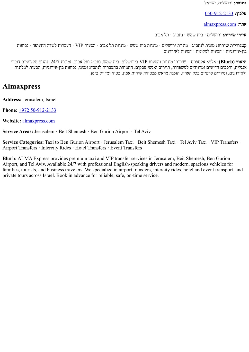 לארשי ,םילשורי :תבותכ 050-912-2133:ןופלט almaxpress.com:רתא ביבא לת · ג״בתנ · שמש תיב · םילשורי :תוריש ירוזא תועיסנ · הפועתה הדשל תורבעה · VIP תועסה · ביבא לת תוינומ · שמש תיב תוינומ · םילשורי תוינומ · ג״בתנל תינומ :תוריש תוירוגטק םיעוריאל תועסה · תונולמל תועסה · תוינוריע-ןיב ירבוד םייעוצקמ םיגהנ ,24/7 תונימז .ביבא לתו ג״בתנ ,שמש תיב ,םילשוריב VIP תועסהו תוינומ יתוריש – סרפסקא אמלא :(Blurb) רואית תונולמל תועסה ,תוינוריע-ןיב תועיסנ ,ונממו ג״בתנל תורבעהב תוחמתה .םיקסע ישנאו םיריית ,תוחפשמל םיחוורמו םישידח םיבכרו ,תילגנא .ןמזב קיודמו חוטב ,ןימא תוריש החיטבמ שארמ הנמזה .ץראה לכב םייטרפ םירויסו ,םיעוריאלו Almaxpress Address: Jerusalem, Israel Phone:+972 50-912-2133 Website:almaxpress.com Service Areas: Jerusalem · Beit Shemesh · Ben Gurion Airport · Tel Aviv Service Categories: Taxi to Ben Gurion Airport · Jerusalem Taxi · Beit Shemesh Taxi · Tel Aviv Taxi · VIP Transfers · Airport Transfers · Intercity Rides · Hotel Transfers · Event Transfers Blurb: ALMA Express provides premium taxi and VIP transfer services in Jerusalem, Beit Shemesh, Ben Gurion Airport, and Tel Aviv. Available 24/7 with professional English-speaking drivers and modern, spacious vehicles for families, tourists, and business travelers. We specialize in airport transfers, intercity rides, hotel and event transport, and private tours across Israel. Book in advance for reliable, safe, on-time service.