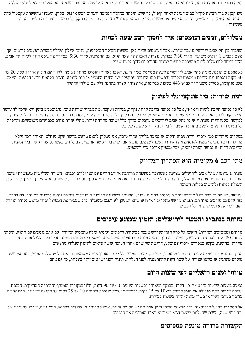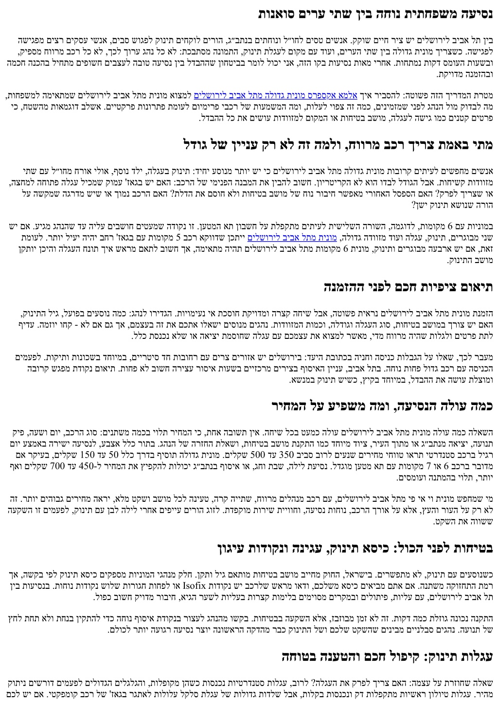 .הדלשב עוגפל אל ידכ ןעטמ את יחיטש ךכסי וא קומע ןעטמ את םע בכר איבי שארמ עדייש גהנ .הנמזהב תאז ונייצ ,בחר םגד וא תינוויכ-וד הלגע ההכ ליטסקט תראשהמ וענמיה ,ץיקב .קזנ וא שער םורגתו העיסנה ךלהמב חתפית אלש ךכ ,לופיק רחאל הלגעה ביבס 'ץוקס תעוצר ורשק :ןטק פיט הז המכ דמלת םיירהצב 1 שיבכ לע קקפב הדימעב העש יצח ?ינונטק עמשנ .קוניתה בשומ תא םמחי אלש ידכ ,שמש ינפל ןעטמה את תיזחב .יתועמשמ תוחפל העש עבר ךוסחל ךיא :םיסמועו םינמז ,םילולסמ ךא ,םימרוז םימעפל תלצבח ףלחמו ןולייא יביתנ ,תומדקומה רקובה תועשב .ןאכ ןיידע םיסמועה לבא ,גורדש רבע םילשוריל ביבא לת ןיב רוביחה ,ביבא לת ןוויכל רזוח סמועה םיירהצב .9:30 ירחא תונתמתה םע ,איגה רעש דע תוטאה תורצונ ,רקובב 7:30 ירחא .הנתשמ סופדה 1 שיבכל םשמ .לואש תעבג ףלחמבו בורחס תוניגל ךומסב תבכעתמ בורל םילשוריל הסינכ דועב דע 20 ,ןטק דלי וא קונית םע ז״ולל .המישנ חוורמ ופיסוהו רוחאל ובשח ,דעיה ריעב תמיוסמ העשל םילשוריל ביבא לתמ תינומ תנמזה םיננכתמשכ האיצי :תופולח ועיצי םיאיקב םיגהנ .אפורל רות וא י״כנתה תויחה ןגל תלפקתמ הקנולא ומכ תישפיט הליקש סופספמ םכילע ונגי תופסונ תוקד 30 .הלתחה ןחלוש םע קלד תנחתב הרצק הריצע וא ,תומיוסמ תועשב 443 שיבכ ךרד ינשמ לולסמ ,תמדקומ טעמ קוניפל ילנויצקנופ ןיב :תוריש תמר רשקתהל חכוש אלו ןמזב עיגמש גהנ ?בוט תוריש לידבמ המ .הטקשו החוטב ,הייקנ תויהל הכירצ העיסנ לכ לבא ,יפ יא יו תויהל תבייח העיסנ לכ אל ןיתמהל ילב תודווזמהו הלגעה תסמעהב הרזע ,ןיינע הזמ תושעל ילב ץיקב םירק םימ ,םיישיא םיצפחב סומע אלו יונפ ןעטמ את ,ינפל תוקד שמח הדפקהו ,םישבושמ םישיבכב םיחונ ריווא ילתמ ,רתוי תחוורמ הבישי ללכ ךרדב םילבקמ םילשוריל ביבא לתמ יפ יא יו תינומ תיירוגטקב .השקבל .יכב לש העשל עוגר קונית ןיב לידבמש המ הז םימעפל .םיענ חירו סומינ לע אללו הכר הרואת ,טלחומ טקש תשקב שארמ םאתל ץילממ ינא ,הסיט ירחא הלילב העיסנ וא םילוח תיבמ תדלוי ףוסיא ומכ םידחוימ םירקמב תוצאה ילב ,העוגר העיסנ ושקב ,תוילעב הליחב וא השיגר הביק שי םא :הבוט םכמצעל ושע .הריוואה תא םיאתהל וחמשי םיגהנה בור .הקיזומ .עיפשהל ידכ הכורא קיפסמ לבא ,תיסחי הרצק העיסנ וז .תודח תומילבו קיודמה ןורתפה אוה תומוקמ 6 בכר יתמ הבישי תרשפאמ תישילשה הרושה .אתבסו םידלי ינש םע םירוה גוז וא תבחרומ החפשמב רבודמשכ תניוצמ םילשוריל ביבא לתמ תומוקמ 6 תינומ ,ןיעידומל ךומסב ןיתממש אבס לשמל ,ךרדב ףסונ ףוסיא םיננכתמ םתא םא .קוניתה דיל תבשל לוכי הרוההו ,ולש בחרמה תא בייחש דליל תדרפומ .הבושח תולקב בישוהלו חותפל תלוכיה בכרב םא .דחוימב תינלבס הגיהנ תשרוד םילשוריב תופופצ תונוכשל הסינכהו ,תורצ תוינחב םיסמועמ רתוי עפשומ לודג בכר :ריחמ שי ,תאז םע הדרוה תדוקנ שארמ רחבי לולסמה תא ריכמש גהנ .הלגעהמ עגפיי אל ןעטמה אתש ואדו וא ןוגג ןקתמ שארמ ונימזת ,בר דויצ םיבחוס םג םתא הזכ .שיבכה לע דויצ וקרפת אלש ידכ הבחר םיבוכיע ענומש ןומזת :םילשוריל ךשמהו ג״בתנב התיחנ ופיסוה ,קונית םע םיעסונ םתא םא .דחוימה עוסמהמ הלגע ףוסיאו םינוכרד תרוקיבל רבעמ שרדנש ןמזה קרפ לע ובשיח ?תורישי םיכישממו םיתחונ ריחמה תא לגלגל ילב ריבס הנתמה חוורמ םיריאשמו הסיט בקעמ םימאתמ םיסונמ םיגהנ .ףרוחב דחוימב ,השבלהו הלתחהל תוקד 20 תוחפל .םישערמ ץחלנש קוניתל םיאלפ השוע הסיטה ירחא טקש לש השגרה ,טלש םע ףוסיא שרופמב ושקב ,הנמזהב .תידיימ העש יצח ואצ ,שימג םכלש ז״ולה םא .תיתועמשמ התוא ךיראהל םילולע ישימח ברע יקקפ לבא ,ביבא לתל תיסחי הרצק םילשוריל ג״בתנמ ךרדה .םתא םג ךכ ,תוילעב רתוי בוט ןשי ןנער קונית .היילעה ינפל תוננערתהל תוקד רשע לש הריצע ושקב וא ליגרהמ םדקומ םויה תועש יפל םיילאיר םינמז יחווט תסנכה .תוקיודמה הדרוההו ףוסיאה תודוקנב יולת ,תוקד 90 דע 60 ,סמועה תועשבו רחואמה רקובב .תוקד 55-ל 40 ןיב תוטקש תועשב העיסנ םא דחוימב ,הנוכשל העגהה דע תוקד 25 דע 10 םיתיעל הפיסומ המצע םילשורי .תוקד 15 דע 10-כב ללוכה ןמזה תא הלידגמ תח