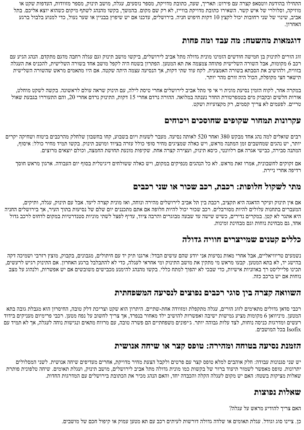 תונאוס םירע יתש ןיב החונ תיתחפשמ העיסנ השיגפמ םיצר םיקסע ישנא ,םיבס שוגפל קונית םיחקול םירוה ,ג״בתנב םיתחונו ל״וחל םיסט םישנא .קקוש םייח ריצ שי םילשוריל ביבא לת ןיב ,קיפסמ חוורמ בכר לכ אל ,ךכל ךורע גהנ לכ אל :תכבתסמ הנומתה ,קונית תלגעל םוקמ םע דועו ,םירעה יתש ןיב הלודג תינומ ךירצשכ .השיגפל המכח הנכהב ליחתמ םיפושח םיבצעל הבוט העיסנ ןיב לדבההש ןוחטיבב רמול לוכי ינא ,הזה וקב תועיסנ תואמ ירחא .תוחתמנ תוקד סמועה תועשבו .תקיודמ הנמזהבו ,תוחפשמל המיאתמש םילשוריל ביבא לתמ תינומ אוצמל םילשוריל ביבא לתמ הלודג תינומ סרפסקא אמלא ךיא ריבסהל :הטושפ הזה ךירדמה תרטמ יכ ,חטשהמ תואמגוד בלשא .םייטקרפ תונורתפ תמועל םוימירפ יבכר לש תועמשמה המו ,תולעל יופצ הז המכ ,םינימזמש ינפל גהנה לומ קודבל המ .לדבהה לכ תא םישוע תודווזמל םוקמה וא תוחיטב בשומ ,הלגעל השיג ומכ םינטק םיטרפ לדוג לש ןיינע קר אל הז המלו ,חוורמ בכר ךירצ תמאב יתמ יתש םע ל״וחמ חרוא ילוא ,ףסונ דלי ,הלגעב קונית :דיחי עסונמ רתוי שי יכ םילשוריל ביבא לתמ הלודג תינומ תובורק םיתיעל םישפחמ םישנא ,הצחמל החותפ הלגע ליכמש קומע 'זאגב שי םאה :בכרה לש ימינפה הנבמה תא ןיבהל בושח .ןוירטירקה אל אוה ודבל לדוגה לבא .תוחישק תודווזמ לע השקמש הגרדמ שיש וא ךומנ בכרה םאה ?תלדה תא םסוח אלו תוחיטב בשומ לש חונ רוביח רשפאמ ירוחאה לספסה םאה ?קרפל ךירצש וא ?ןשי קונית אשונש הרוה שי םא .עיגמ גהנהש דע הילע םיבשוח םיטעמש הדוקנ וז .ןעטמה את ןובשח לע תלפקתמ םיתיעל תישילשה הרושה ,המגודל ,תומוקמ 6 םע תוינומב תמועל .רתוי ליעי היהי בחר 'זאגב םע תומוקמ 5 בכר אקוודש ןכתיי םילשוריל ביבא לתמ תינומ ,הלודג הדווזמ דועו הלגע ,קונית ,םירגובמ ינש ןקתוי ןכיהו הלגעה חנות ךיא שארמ םאתל בושח ךא ,המיאתמ היהת םילשוריל ביבא לתמ תומוקמ 6 תינומ ,קוניתו םירגובמ העברא שי םא ,תאז .קוניתה בשומ הנמזהה ינפל םכח תויפיצ םואית ,קוניתה ליג ,לעופב םיעסונ המכ :גהנל ורידגה .תויומיענ יא תכסוח תקיודמו הרצק החיש לבא ,הטושפ תיארנ םילשוריל ביבא לתמ תינומ תנמזה ףידע .המזוי וחק - אל םא םג ךא ,םמצעב הז תא םכתא ולאשי םיסונמ םיגהנ .תודווזמה תומכו ,הלדוגו הלגעה גוס ,תוחיטב בשומב ךרוצ שי םאה .ללכ תסנכנ אלש וא האיצי תמסוחש הלגע םע םכמצע תא אוצמל רשאמ ,ידמ חוורמ היהש תולגלו םיטרפ תתל םימעפל .תוקיתו תונוכשב דחוימב ,םיירטיס דח תובוחר םע םירצ םירוזא שי םילשוריב :דעיה תבותכב הינחו הסינכ תולבגה לע ולאש ,ךכל רבעמ הבורק שגפמ תדוקנ םואית .תוחפ אל בושח הריצע רוסיא תועשב םייזכרמ םיריצב ףוסיאה ןיינע ,ביבא לתב .החונ תוחפ לודג בכר םע הסינכה .אשנמב קונית שישכ ,ץיקב דחוימב ,לדבהה תא השוע תלצומו ריחמה לע עיפשמ המו ,העיסנה הלוע המכ קיפ ,העשו םוי ,בכרה גוס :םינתשמ המכב יולת ריחמה יכ ,תחא הבושת ןיא .החיש לכב טעמכ הלוע םילשוריל ביבא לתמ תינומ הלוע המכ הלאשה םוי עצמאב הרישי העיסנל ,עבצא ללכ רותב .גהנה לש הרזחה תלאשו ,תוחיטב בשומ תנקתה ומכ דחוימ דויצ ,ריעה ךותמ וא ג״בתנמ האיצי ,העונת םא רקיעב ,םילקש 150 דע 50 ללכ ךרדב ףיסות הלודג תינומ .םילקש 500 דע 350 ביבס בורל םיענש םיריחמ יחווט וארת יטרדנטס בכרב ליגר ףאו םילקש 700 דע 450-ל ריחמה תא ץיפקהל תולוכי ג״בתנב ףוסיא וא ,גחו תבש ,הליל תעיסנ .לדגומ ןעטמ את םע תומוקמ 7 וא 6 בכרב רבודמ .םיסמועו הנתמהב יולת ,רתוי הז .רתוי םיהובג םיריחמ הארי ,אלמ טקשו בשומ לכל הניעט ,הרק הייתש ,חוורמ םילהנמ בכר םע ,םילשוריל ביבא לתמ יפ יא יו תינומ שפחמש ימ העקשה וז םימעפל ,קונית םע ןבל הליל ירחא םיפייע םירוה גוזל .תדפקומ תוריש תייווחו ,העיסנ תוחונ ,בכרה ךרוא לע אלא ,ץעהו רועה לע קר אל .טקשה תא הוושש ןוגיע תודוקנו הניגע ,קונית אסיכ :לוכה ינפל תוחיטב ךא ,השקב יפל קונית אסיכ םיקפסמ תוינומה יגהנמ קלח .ןקתו ליג םאתומ תוחיטב בשומ בייחמ קוחה ,לארשיב .םירשפתמ אל ,קונית םע םיעסונשכ ןיב תועיסנב .תוחונ תודוקנ שולש תורוגח תוחפל וא Isofix תודוקנ שי בכרלש שארמ ואדו ,םכלשמ א