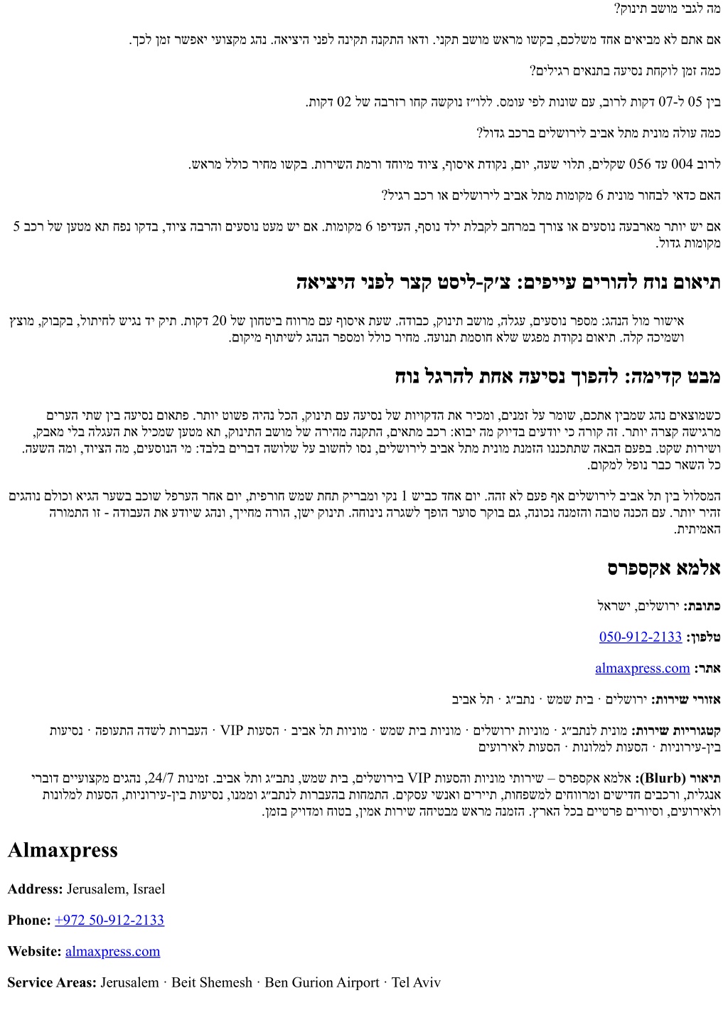 Service Categories: Taxi to Ben Gurion Airport · Jerusalem Taxi · Beit Shemesh Taxi · Tel Aviv Taxi · VIP Transfers · Airport Transfers · Intercity Rides · Hotel Transfers · Event Transfers Blurb: ALMA Express provides premium taxi and VIP transfer services in Jerusalem, Beit Shemesh, Ben Gurion Airport, and Tel Aviv. Available 24/7 with professional English-speaking drivers and modern, spacious vehicles for families, tourists, and business travelers. We specialize in airport transfers, intercity rides, hotel and event transport, and private tours across Israel. Book in advance for reliable, safe, on-time service.
