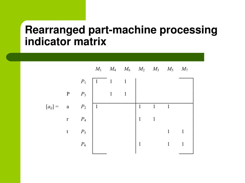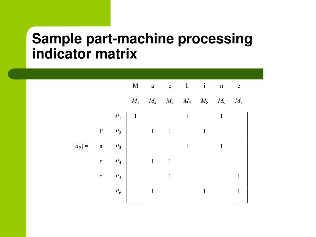 Row and Column Masking Algorithm Step 1: Draw a horizontal line through the first row. Select any 1 entry in the matrix through which there is only one line. Step 2: If the entry has a horizontal line, go to step 2a. If the entry has a vertical line, go to step 2b. Step 2a: Draw a vertical line through the column in which this 1 entry appears. Go to step 3. Step 2b: Draw a horizontal line through the row in which this 1 entry appears. Go to step 3. Step 3:If there are any 1 entries with only one line through them, select any one and go to step 2. Repeat until there are no such entries left. Identify the corresponding machine cell and part family. Go to step 4. Step 4: Select any row through which there is no line. If there are no such rows, STOP. Otherwise draw a horizontal line through this row, select any 1 entry in the matrix through which there is only one line and go to Step 2.