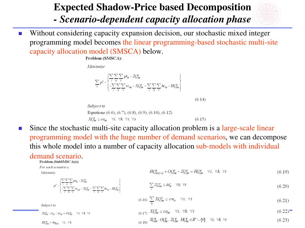 Expected Shadow-Price based Decomposition- Scenario-dependent capacity allocation phase Without considering capacity expansion decision, our stochastic mixed integer programming model becomes the linear programming-based stochastic multi-site capacity allocation model (SMSCA) below. Since the stochastic multi-site capacity allocation problem is a large-scale linear programming model with the huge number of demand scenarios, we can decompose this whole model into a number of capacity allocation sub-models with individual demand scenario.