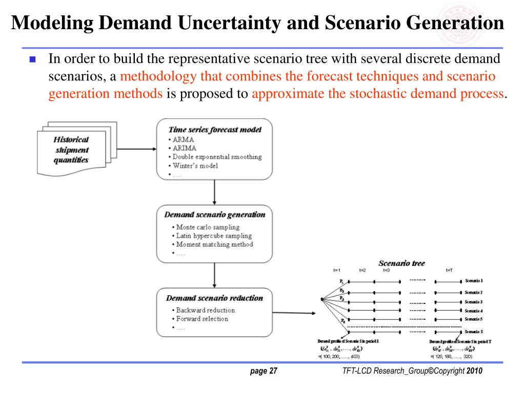 Modeling Demand Uncertainty and Scenario Generation(2)-Demand scenario generation(TFT-LCD case) 100 simulation scenarios (sample paths) of all products by the monte carlo sampling
