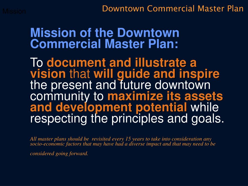 Mission Downtown Commercial Master Plan Mission of the Downtown Commercial Master Plan: To document and illustrate a vision that will guide and inspire the present and future downtown community to maximize its assets and development potentialwhile respecting the principles and goals. All master plans should be revisited every 15 years to take into consideration any socio-economic factors that may have had a diverse impact and that may need to be considered going forward.