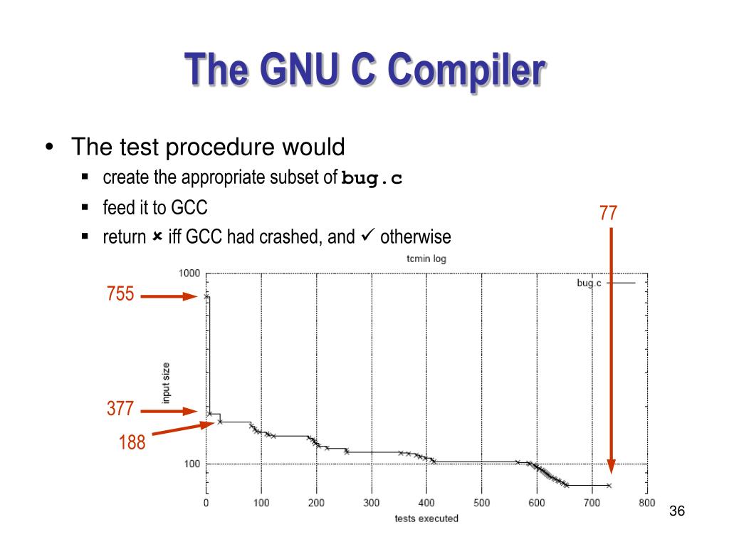 The GNU C Compiler • The test procedure would • create the appropriate subset of bug.c • feed it to GCC • return iff GCC had crashed, and otherwise 77 755 377 188