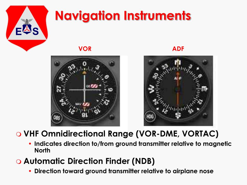 Navigation Instruments VOR ADF • VHF Omnidirectional Range (VOR-DME, VORTAC) • Indicates direction to/from ground transmitter relative to magnetic North • Automatic Direction Finder (NDB) • Direction toward ground transmitter relative to airplane nose