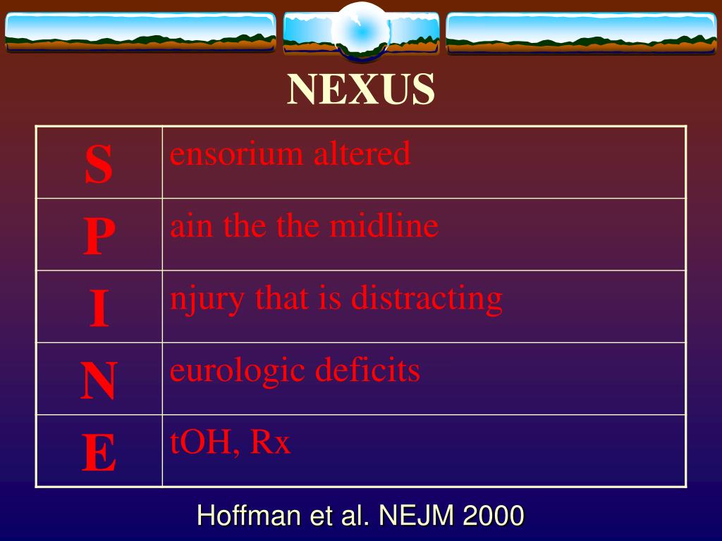 What films? • CXR – Yes • Pelvis – Yes (symptomatic) • Can you clear his C-spines clinically? • According to CCR? • According to NEXUS?