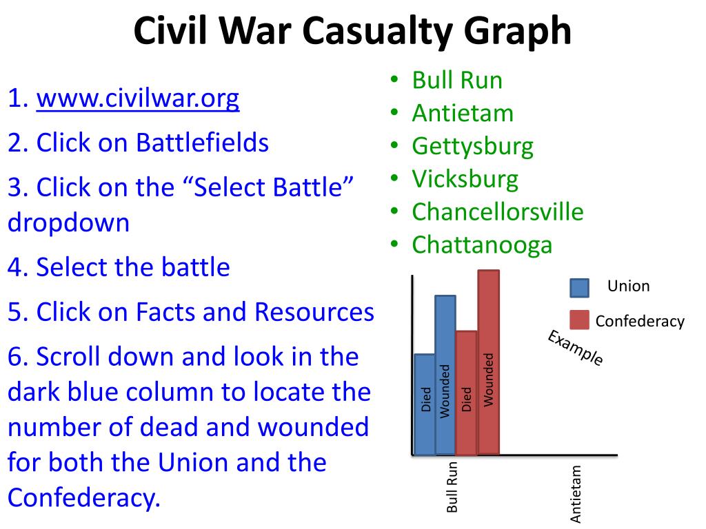 Civil War Casualty Graph • Bull Run • Antietam • Gettysburg • Vicksburg • Chancellorsville • Chattanooga 1. www.civilwar.org2. Click on Battlefields3. Click on the “Select Battle” dropdown4. Select the battle5. Click on Facts and Resources6. Scroll down and look in the dark blue column to locate the number of dead and wounded for both the Union and the Confederacy. Union Confederacy Example Wounded Wounded Died Died Bull Run Antietam
