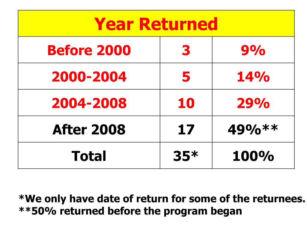 *We only have date of return for some of the returnees.**50% returned before the program began