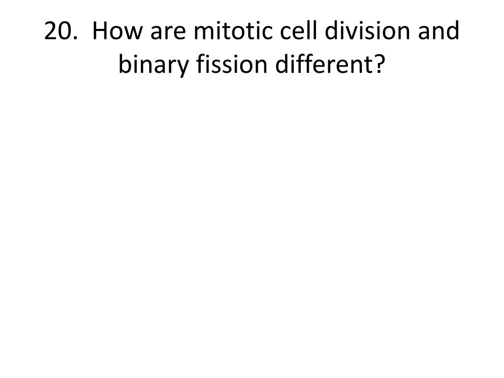 19. How are mitotic cell division and binary fission similar? Both involve one cell dividing into 2 identical cells.