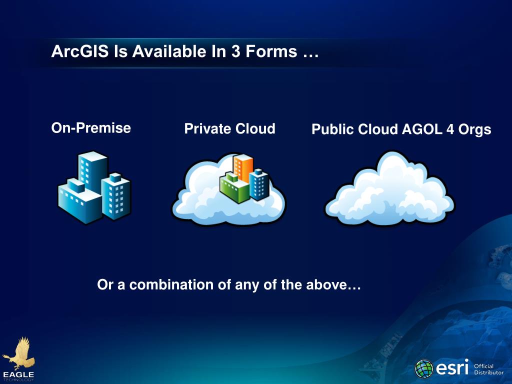 ArcGIS Is Available In 3 Forms … Private Cloud On-Premise Public Cloud AGOL 4 Orgs Or a combination of any of the above…