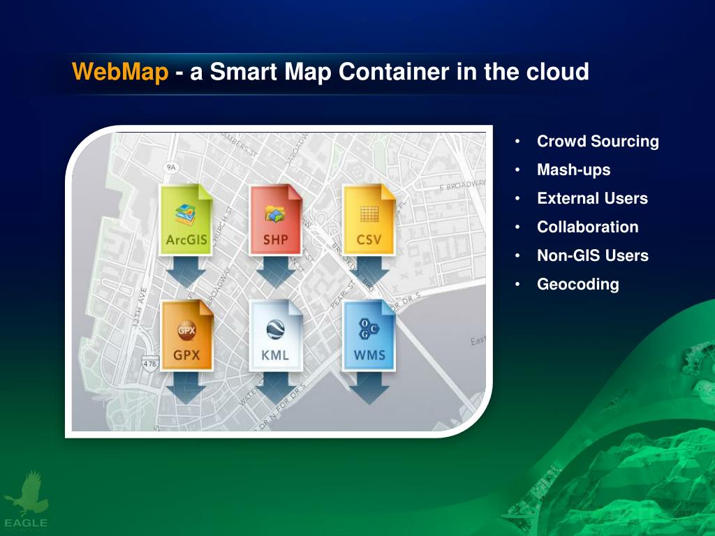 WebMap- a Smart Map Container in the cloud • Crowd Sourcing • Mash-ups • External Users • Collaboration • Non-GIS Users • Geocoding