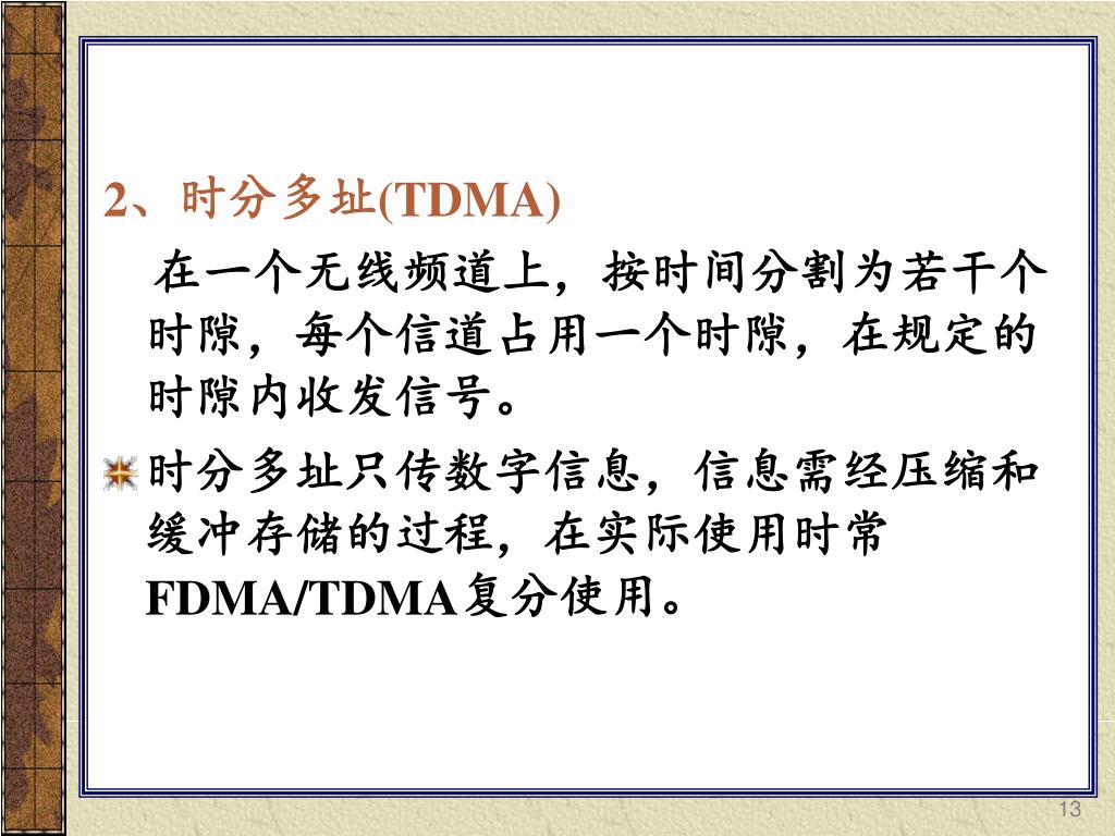 2、时分多址(TDMA) 在一个无线频道上,按时间分割为若干个时隙,每个信道占用一个时隙,在规定的时隙内收发信号。 • 时分多址只传数字信息,信息需经压缩和缓冲存储的过程,在实际使用时常 FDMA/TDMA复分使用。