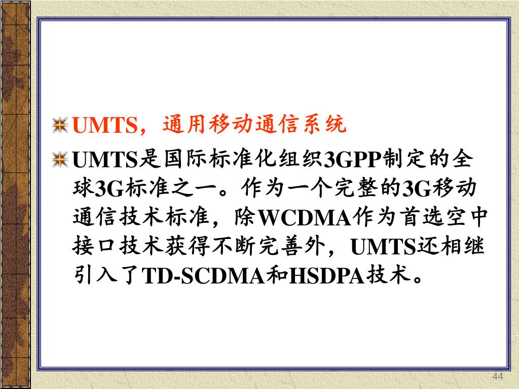 UMTS,通用移动通信系统 • UMTS是国际标准化组织3GPP制定的全球3G标准之一。作为一个完整的3G移动通信技术标准,除WCDMA作为首选空中接口技术获得不断完善外,UMTS还相继引入了TD-SCDMA和HSDPA技术。