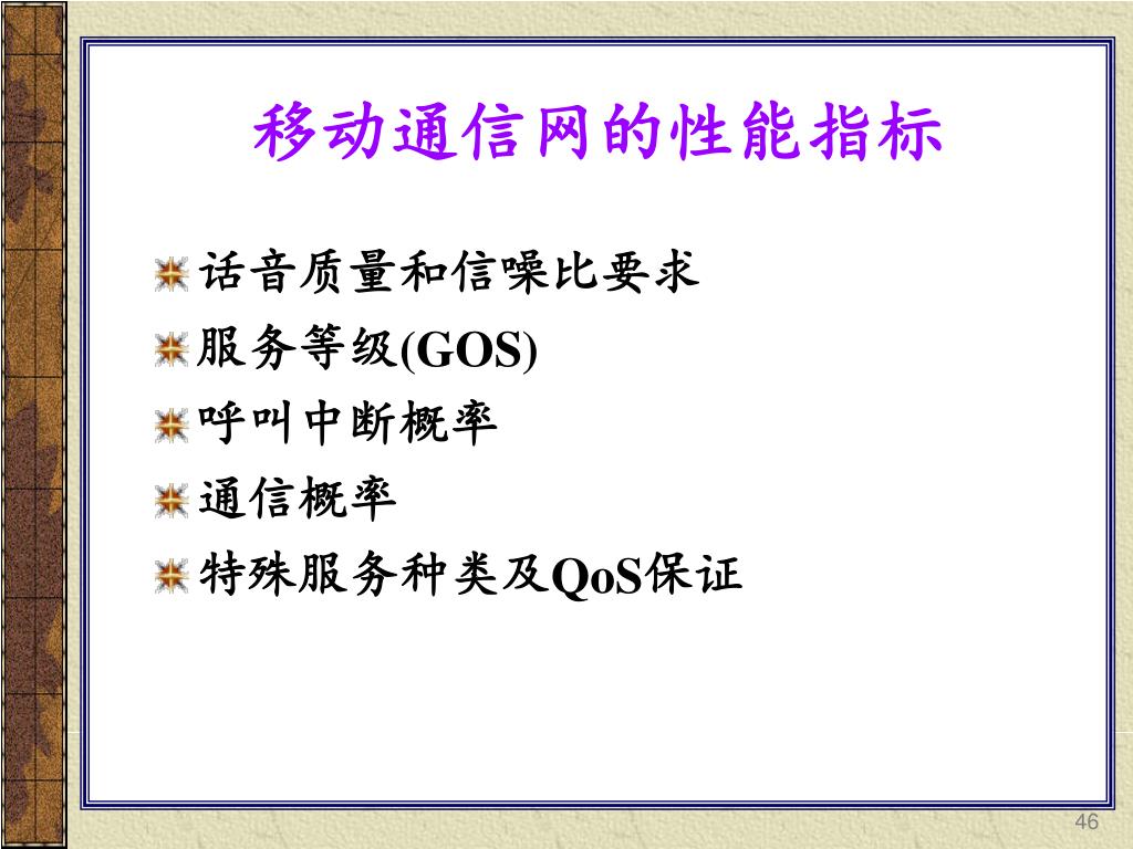 移动通信网的性能指标 • 话音质量和信噪比要求 • 服务等级(GOS) • 呼叫中断概率 • 通信概率 • 特殊服务种类及QoS保证