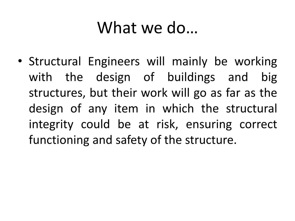 What we do… • Structural Engineers will mainly be working with the design of buildings and big structures, but their work will go as far as the design of any item in which the structural integrity could be at risk, ensuring correct functioning and safety of the structure.