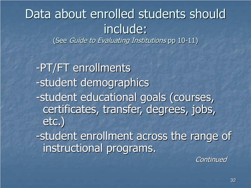 Data about enrolled students should include:(See Guide to Evaluating Institutions pp 10-11) -PT/FT enrollments -student demographics -student educational goals (courses, certificates, transfer, degrees, jobs, etc.) -student enrollment across the range of instructional programs. Continued