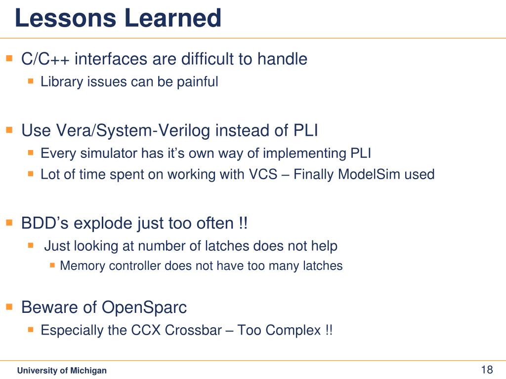Lessons Learned • C/C++ interfaces are difficult to handle • Library issues can be painful • Use Vera/System-Verilog instead of PLI • Every simulator has it’s own way of implementing PLI • Lot of time spent on working with VCS – Finally ModelSim used • BDD’s explode just too often !! • Just looking at number of latches does not help • Memory controller does not have too many latches • Beware of OpenSparc • Especially the CCX Crossbar – Too Complex !!