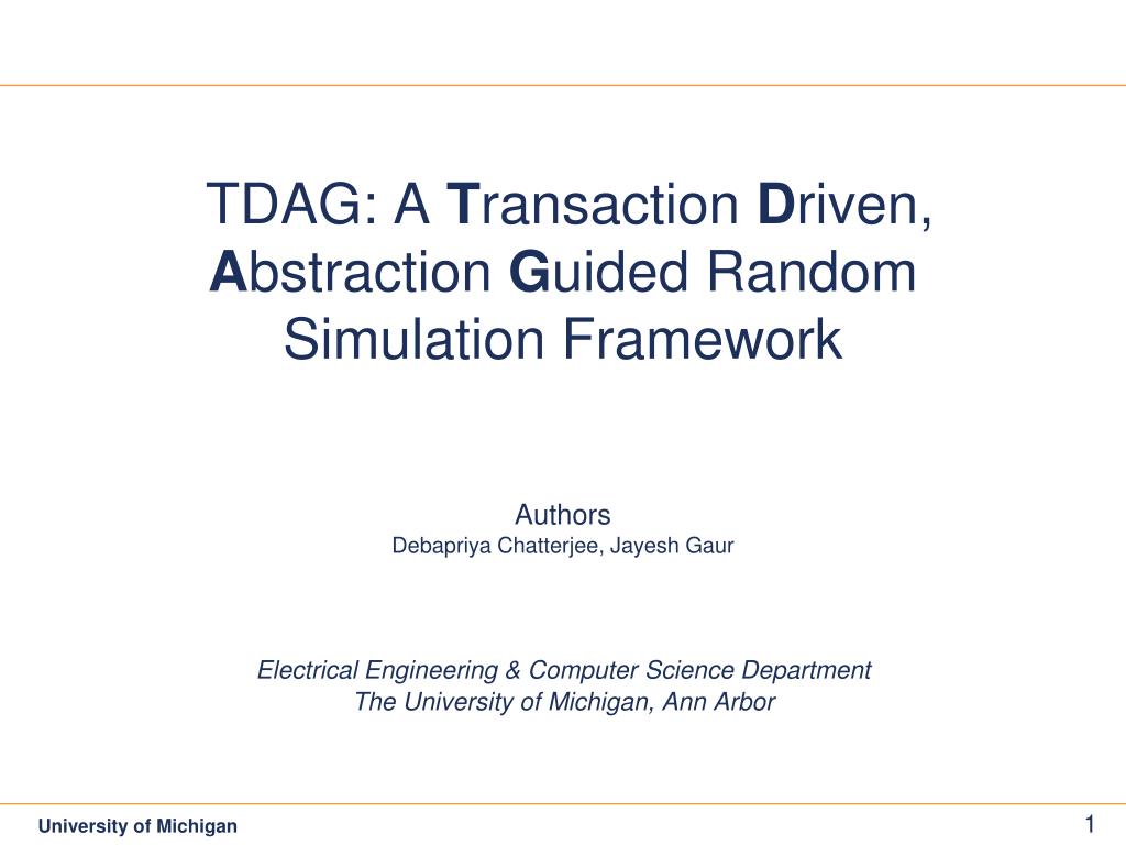 TDAG: A Transaction Driven, Abstraction Guided Random Simulation Framework Authors Debapriya Chatterjee, Jayesh Gaur Electrical Engineering & Computer Science Department The University of Michigan, Ann Arbor