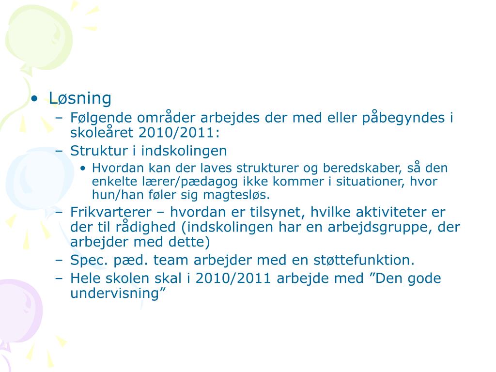 Løsning • Følgende områder arbejdes der med eller påbegyndes i skoleåret 2010/2011: • Struktur i indskolingen • Hvordan kan der laves strukturer og beredskaber, så den enkelte lærer/pædagog ikke kommer i situationer, hvor hun/han føler sig magtesløs. • Frikvarterer – hvordan er tilsynet, hvilke aktiviteter er der til rådighed (indskolingen har en arbejdsgruppe, der arbejder med dette) • Spec. pæd. team arbejder med en støttefunktion. • Hele skolen skal i 2010/2011 arbejde med ”Den gode undervisning”