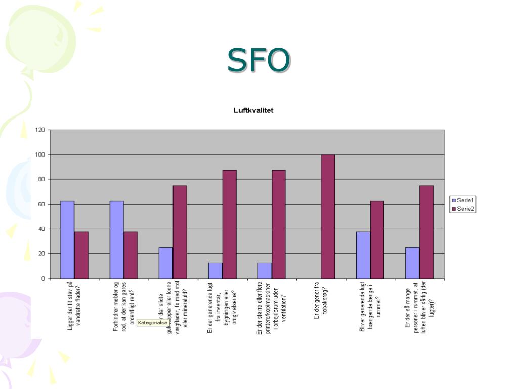 Skiftende temperaturer/ træk • Årsag • Manglende ventilationssystem • Løsning • Ventilationssystem eller andet i forbindelse med renovering. • Der er lavet termografiske undersøgelser af lokalerne og teknisk afdeling er bekendt med problematikken.