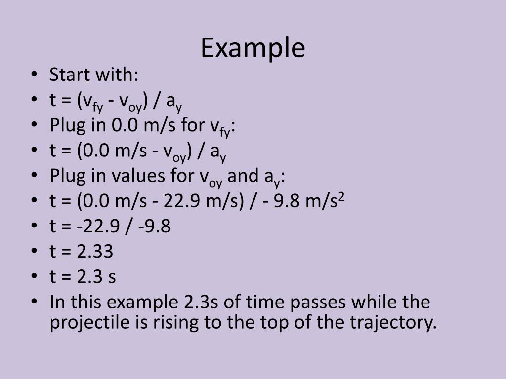 Example • Start with: • t = (vfy - voy) / ay • Plug in 0.0 m/s for vfy: • t = (0.0 m/s - voy) / ay • Plug in values for voy and ay: • t = (0.0 m/s - 22.9 m/s) / - 9.8 m/s2 • t = -22.9 / -9.8 • t = 2.33 • t = 2.3 s • In this example 2.3s of time passes while the projectile is rising to the top of the trajectory.