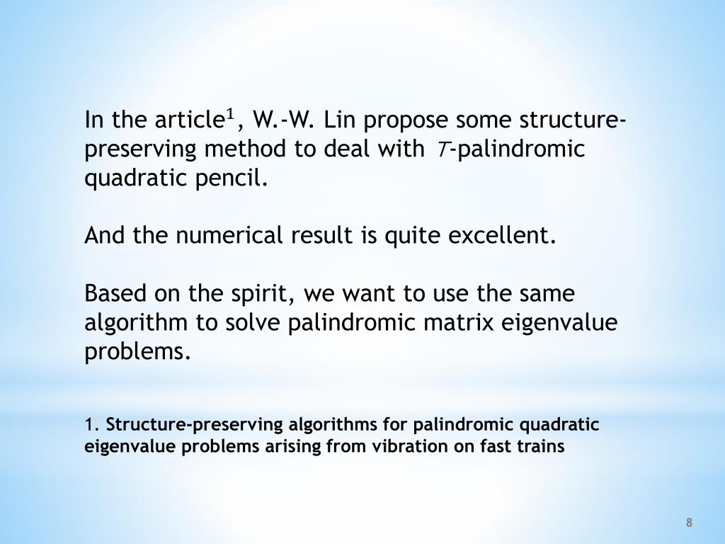 In the , W.-W. Lin propose some structure-preserving method to deal with ⊤-palindromic quadratic pencil. And the numerical result is quite excellent. Based on the spirit, we want to use the same algorithm to solve palindromic matrix eigenvalue problems. 1. Structure-preserving algorithms for palindromic quadratic eigenvalue problems arising from vibration on fast trains