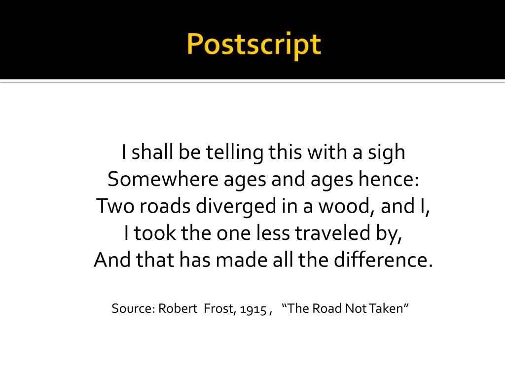 Postscript I shall be telling this with a sighSomewhere ages and ages hence:Two roads diverged in a wood, and I,I took the one less traveled by,And that has made all the difference. Source: Robert Frost, 1915 , “The Road Not Taken”