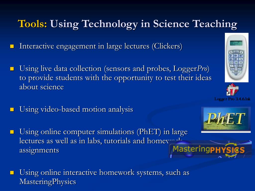 Tools: Using Technology in Science Teaching Interactive engagement in large lectures (Clickers) Using live data collection (sensors and probes, LoggerPro) to provide students with the opportunity to test their ideas about science Using video-based motion analysis Using online computer simulations (PhET) in large lectures as well as in labs, tutorials and homework assignments Using online interactive homework systems, such as MasteringPhysics