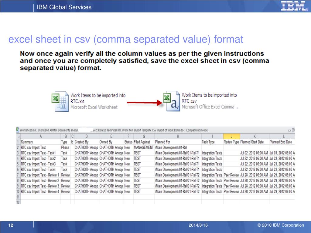 Objective • The following slides gives you a step by step instructions on how to import work items into RTC from comma separated value (csv) files. • Even though ‘Import of Work Items from CSV’ is a single step process from RTC Client, in order to make all the work items that gets imported properly fit in to the process template designed for your project, we need to evaluate the excel file provided by end users thoroughly. We will have to alter few of the columns to accommodate it properly to RTC.