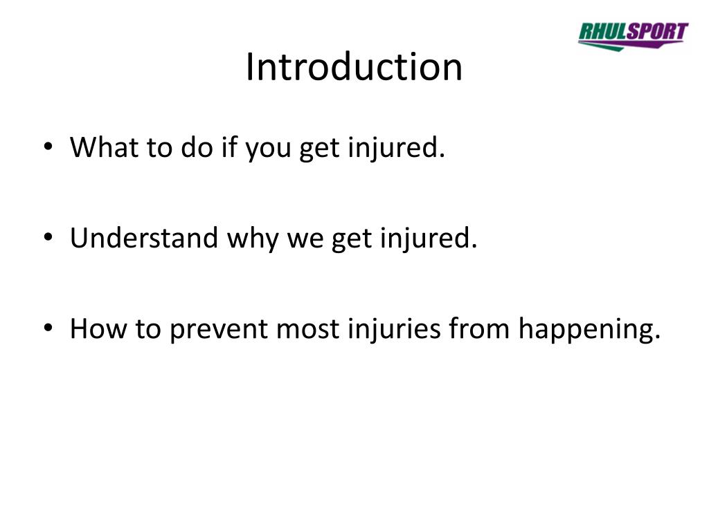 Introduction • What to do if you get injured. • Understand why we get injured. • How to prevent most injuries from happening.