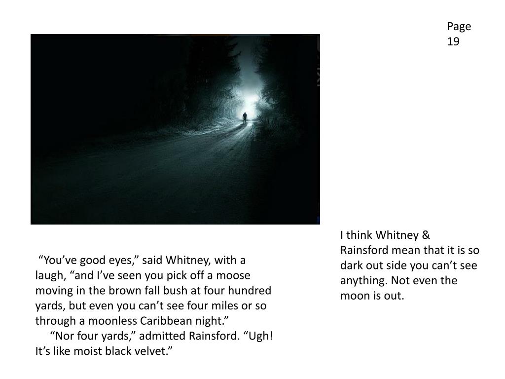 Page 19 I think Whitney & Rainsford mean that it is so dark out side you can’t see anything. Not even the moon is out. “You’ve good eyes,” said Whitney, with a laugh, “and I’ve seen you pick off a moose moving in the brown fall bush at four hundred yards, but even you can’t see four miles or so through a moonless Caribbean night.” “Nor four yards,” admitted Rainsford. “Ugh! It’s like moist black velvet.”