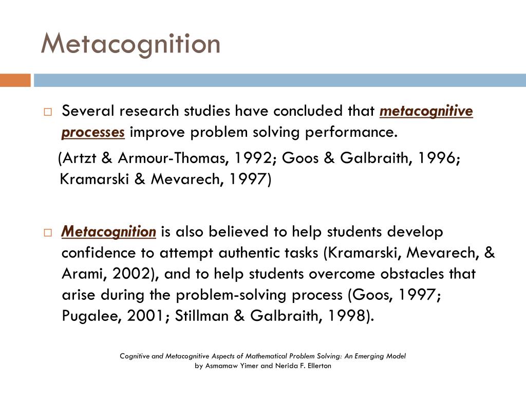 Problem solving and metacognition “Without metacognitive monitoring, students are less likely to take one of the many paths available to them, and almost certainly are less likely to arrive at an elegant mathematical solution.” Cognitive and Metacognitive Aspects of Mathematical Problem Solving: An Emerging Model by AsmamawYimer and NeridaF. Ellerton
